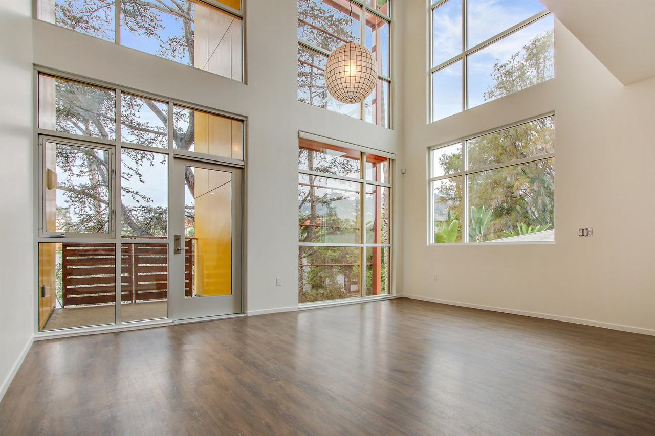 Very unique treehouse-like unit on upper level with views and lots of light. Large bathroom with soaking tub and walk-in closet. Modern townhome building in the heart of West Hollywood. Private, safe and secure- only 16 units, all two-story with 21' high ceilings in the living area. Great walking neighborhood, restaurants, shopping and entertainment are just outside your door. The building is located in the middle of the block; special sound isolating walls and ceilings insure your utmost peace and quiet. Non-smoking building. Secure onsite storage available. Dog OK up to 30 lbs. ($50 pet rent) Sorry, no cats. Bring your Tesla; electric car chargers available in all parking spaces.