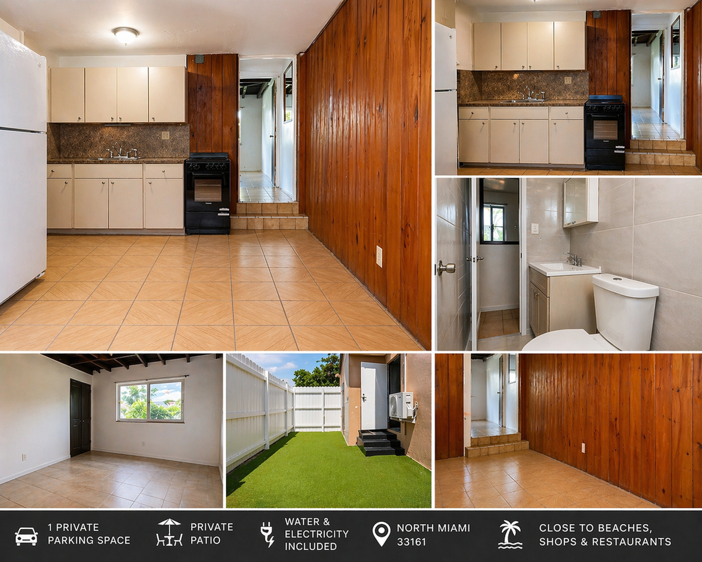 š” FOR RENT ā North Miami (33161) 1 Bed | 1 Bath | 450 Sq Ft | $1,850/month Annual Lease | Water & Electricity Included | Private Parking ⨠Property Description Charming and private 1-bedroom, 1-bath apartment located in the heart of North Miami. This cozy 450 sq ft unit offers a functional layout with a full kitchen, spacious bedroom, and updated bathroom. Enjoy tile flooring throughout, great natural light, and your own outdoor patio space perfect for relaxing or entertaining. This unit also includes one designated private parking space, a rare convenience in the area. The kitchen features ample cabinet storage, countertop workspace, and range. The unit is equipped with a wall-mounted A/C for efficient cooling (Plus Central AC). Perfect for a working professional or couple seeking a private, centrally located home with utilities included. š Features 1 Bedroom / 1 Bathroom Approx. 450 Sq Ft 1 Private Parking Space Included š...