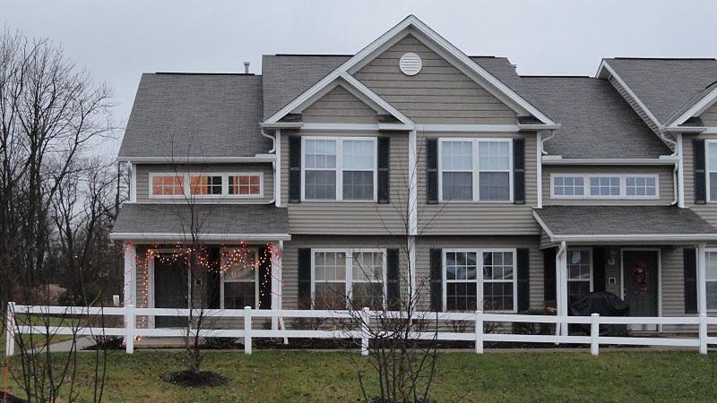 End unit town-home built 2007. Living room with vaulted ceiling. Carpet throughout, ceiling fan, track lights. 2 closets. 1/2 bath. Dining room. Laundry room with washer/dryer. Kitchen with side by side refrigerator, microwave, gas stove, pantry, double sink. disposal, dishwasher, Maple cabinets, ceramic tiles. 2nd floor: master bedroom with vaulted ceilings, walk in closet, full bathroom with tub and stall shower. 2nd bedroom with full bath, closet. 2 car attached garage. A/C. Neutral decor. worry free lawn care & snow removal.