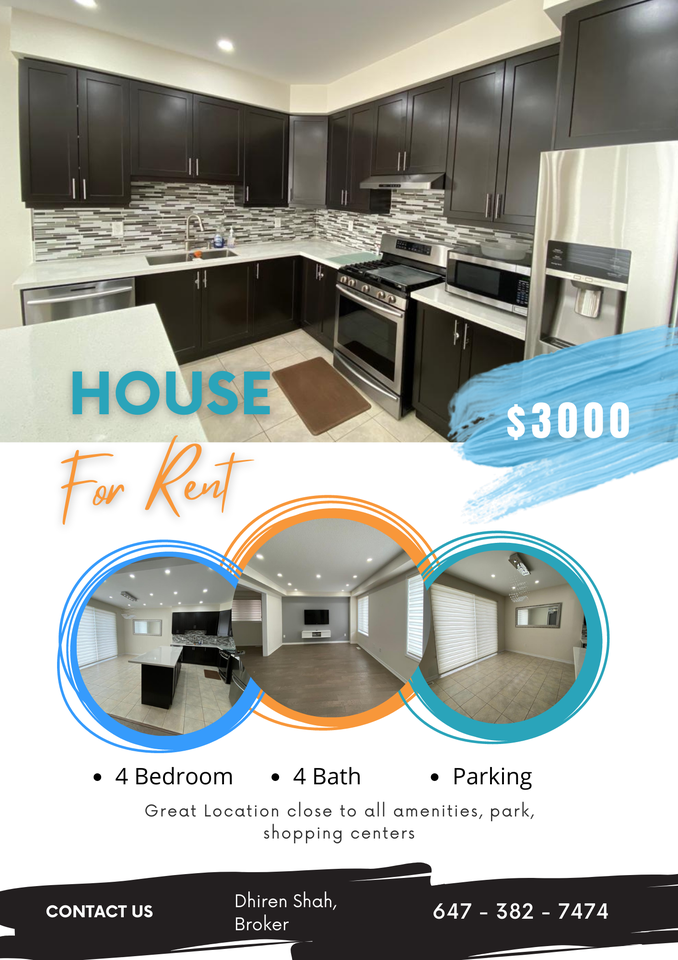 House for Rent Well maintained and spacious with 4 bedrooms and 3 baths. Large kitchen. Parking available. This Fully Detached Property Is Perfect For Families. Location close to all amenities, park, shopping center, walking distance to schools, and more. AAA Tenant Only. Full Credit report, job letter, last pay stubs. 3 references.