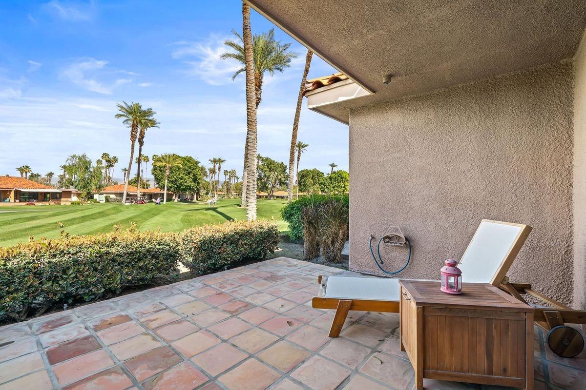 This 1 bedroom, 1.5 bath condo sits in a prime location with no neighboring condos across the street, offering privacy and a panoramic mountain view with the Rancho Mirage library and observatory in the background. It has a sweeping golf course view off the back patio, and a private courtyard entry with citrus trees that opens to the big mountain views framed by walls covered in bougainvillea. This unit has been partially updated and the kitchen has been opened to the living area which offers plenty of natural light. The 1-car plus golf cart garage has extra storage, laundry, and a black & white checkered tile floor (removable). You'll enjoy being just steps away from the pool & spa, and having easy access to the practice net across the street. Sunrise Country Club is a 24 hr. guard gated community in the heart of Rancho Mirage, close to Eisenhower hospital, Agua Caliente casino, and world-class restaurants and shopping. This sought after club offers an 18-hole executive golf course...