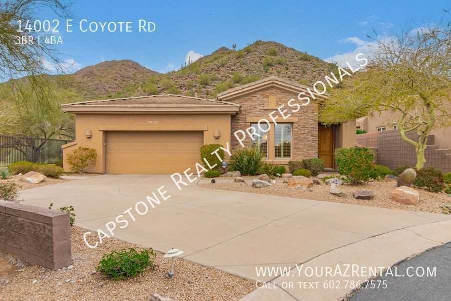 Light, bright, and very private 3 Bedroom 3.5 Bath plus den home in beautiful Scottsdale, AZ! Home features crisp tile flooring throughout all living areas and warm carpeting in private areas with a gas two-way fireplace. The kitchen is eat-in with plenty of cabinet space, a pantry and nearly-new refrigerator, microwave and dishwasher! Additional highlights include a master bedroom that features a separate shower and bathtub, double sinks with a spacious walk-in closet. Easy to maintain backyard and front yard, that sits on a cul-de-sac with mountain preserve views. Enjoy the mountain views while lounging in the heated pool, sit by the gas fire pit during those chilly winter nights, and enjoy backyard BBQs with the built-in BBQ and sit up bar! Other amenities include a 2-car garage with plenty of built-in cabinets, a Tesla charger, nest doorbell, water softener, inside laundry with washer and dryer. Don't miss out on this great home that is perfect for splendid Arizona living with a heated pool for entertaining. This one won't last long! Monthly Rental Tax Rate: 1.75% Monthly Tenant Benefit Package: $49.99 Security Deposit: Equal to one months rent Refundable Cleaning Deposit: $450.00 Refundable Pet Deposit: $200.00 per pet --- 2 Car Garage Additional Bedroom: Other Bdrm Split; 2 Master Bdrms; Separate Bdrm Exit; Mstr Bdr Walkin Clst Laundry: Washer Included; Dryer Included; Inside Biking/Walking Path Blinds Built In Backyard Bbq Built In Bbq Built In Shelving Dining Area: Formal; Eat In Kitchen; Dining In Lr/Gr; Dining In Fr Dryer Dual Pane Windows Exterior Features: Patio; Covered Patio(s); Private Street(s); Pvt Yrd(s)/Crtyrd(s); Built In Bbq Features: 9+ Flat Ceilings; Fire Sprinklers; Water Softener Owned; Soft Water Loop; Drink Wtr Filter Sys Fire Sprinklers Fireplace: Exterior Fireplace Irrigation System Master Bathroom: Full Bth Master Bdrm; Separate Shwr & Tub; Double Sinks; Tub With Jets Pets Landlord Approval Property Description: Border Pres/Pub Lnd; Hillside Lot; Cul De Sac Lot; City Light View(s); Mountain View(s); North/South Exposure; Adjacent To Wash; Borders Common Area Ro System Smoke Detectors Washer Water Feature Water Softener Windows: Sunscreen(s); Dual Pane; Mechanical Sun Shds; Wood Frames