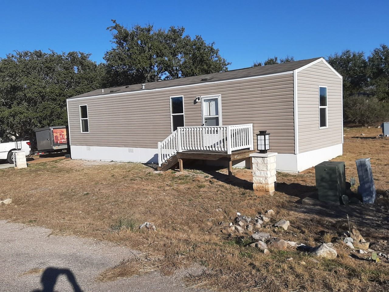 2017 Manufactured home Vinyl floors in kitchen, living dining and bathroom. Carpet in bedrooms Central Heat & Air Ceiling Fan w/Light kit in master bedroom Decks in front and back Nice shade from trees in backyard Generous parking area for 2 cars Marble Falls Schools Convenient to Horseshoe Bay and Marble Falls and about 1 hour to Austin.
