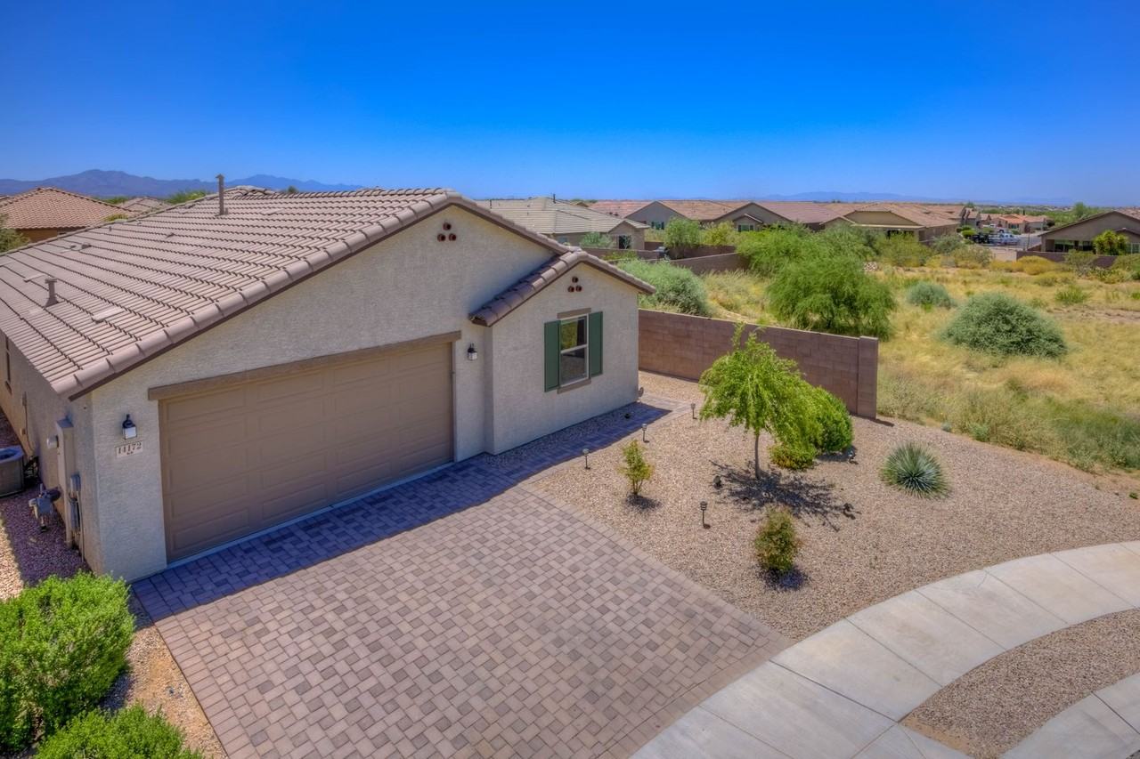 This fantastic 3 bedroom, 2 bath , plus den home is situated on a nice lot at the end of a culdesac aside open space. This 2,013 sqft home offers a view of the mountains in the desirable Vail School District. As you step inside, you'll love the great room concept with ceramic tile flooring throughout, except for the bedrooms that offer carpet flooring. The gourmet kitchen is a masterpiece in itself with ample quartz counter space and cabinetry, a large kitchen island and stainless steel appliances. Neutral paint throughout the house enhances its contemporary feel, making it perfect for those who appreciate style and elegance. The spacious master suite features a walk-in closet, and the ensuite with dual sinks and a walk-in shower. The den can be used as an office or game room. The laundry room is designed for your convenience and includes the washer and dryer. Step outside to the covered patio and relax or entertain in the wonderful landscaped backyard with the extended paver patio, faux grass, pergola, and built-in BBQ area. Fully insulated garage with convenient side door. This home is perfect for outdoor enthusiasts, and you'll find shopping centers, hiking, biking, and other outdoor activities nearby. All pets must be preapproved with extra security deposit. Good credit, income and background required. Please call ot text to view this home.
