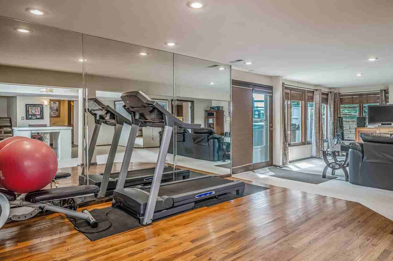 Ranch style home with main floor master an main floor living. 3 bedrooms on 2nd level(one bedroom can be used as a play room/bonus room), all hardwood floors on main level, gourmet kitchen with Thermadour and Viking Appliances, newer granite counters, bathrooms all remodeled with glass and tile, new leaded glass front door, new interior doors, newer lighting, newer carpet, walk in closets, finished basement with 2nd kitchen and office or bedroom, fitness center and walkout to the golf course. Large 3 car garage and mudroom with tons of cabinets. Large kitchen pantry, island and cabinets. Well maintained executive home.