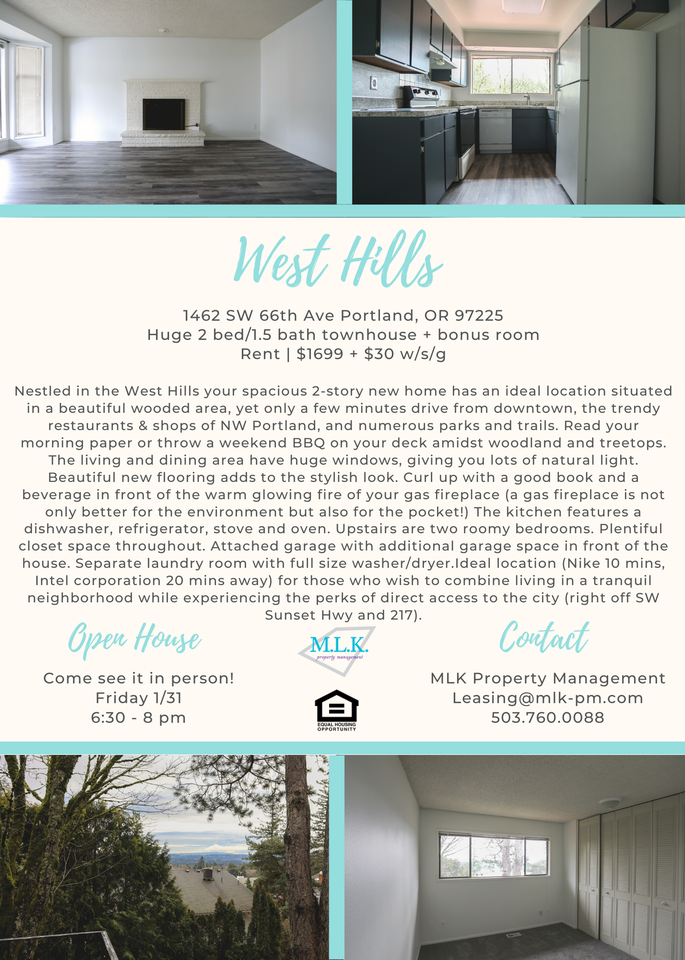 1462 SW 66th Ave Portland, OR 97225 Huge 2 bed/1.5 bath townhouse + bonus room Rent | $1699 + $30 w/s/g Nestled in the West Hills your spacious 2-story new home has an ideal location situated in a beautiful wooded area, yet only a few minutes drive from downtown, the trendy restaurants & shops of NW Portland, and numerous parks and trails. Read your morning paper or throw a weekend BBQ on your deck amidst woodland and treetops. The living and dining area have huge windows, giving you lots of natural light. Beautiful new flooring adds to the stylish look. Curl up with a good book and a beverage in front of the warm glowing fire of your gas fireplace (a gas fireplace is not only better for the environment but also for the pocket!) The kitchen features a dishwasher, refrigerator, stove and oven. Upstairs are two roomy bedrooms. Plentiful closet space throughout. Attached garage with additional garage space in front of the house. Separate laundry room with full size washer/dryer. Ideal location (Nike 10 mins, Intel corporation 20 mins away) for those who wish to combine living in a tranquil neighborhood while experiencing the perks of direct access to the city (right off SW Sunset Hwy and 217). Contact MLK Property Management - leasing@mlk-pm.com 503.760.0088 leasing@MLK-PM.com 503-760-0088