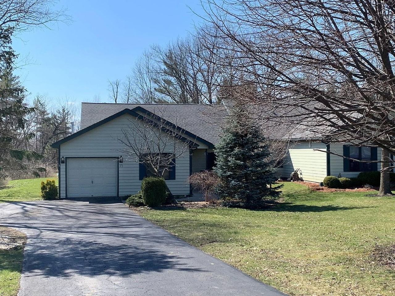 One level living at its finest- located in the coveted Lansing Trails subdivision. Set on a preferred lot within the neighborhood, bordered by small stream on one side and woods behind! Step into this exceptional contemporary floor plan with cathedral ceilings in the kitchen, dining area and living room- kitchen, dining and bathrooms have radiant heated floors! This unit enjoys southern exposure with morning sun on the front and afternoon sun on the back- everything has a light and airy feel. The primary bedroom has expansive bathroom suite with dual closets, stand up shower and soaking tub
