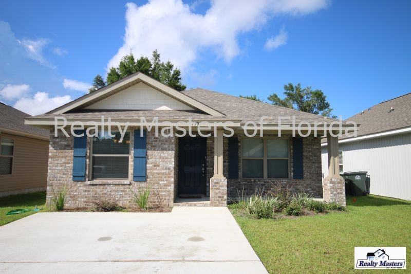 Gorgeous brick patio home located in Lakewood Cottages Subdivision~ Close to NAS, Perdido Beaches, just minutes to shopping, schools and more! ~ Over 1300 sq.ft. of living space with driveway parking. Newly built home features recessed lighting, wood laminate flooring in some areas, open floor plan and inside laundry with a washer and dryer for your convenience. Formal Dining~Living room flows into eat in kitchen . Eat in kitchen has a breakfast bar w/ two stools, breakfast nook, and stainless steel appliances ( fridge, microwave, stove, and dishwasher). Total electric home so no gas bill to worry about! Master bedroom has its own private bath (tub/shower combo, toilet, large vanity) and nice closet space. All utilities and lawn maintenance are tenant responsibility but owner will provide a lawn mower and weed eater for tenant use. To keep the lawn nice and plush the owner will also provide two small sprinkler heads and hose for tenant use to water the grass. This is a pet friendly home with owner approval for mature dogs that are less than 30 lbs but sorry no cats allowed. Storage shed is in fenced back yard with open patio. Home is currently occupied but will be ready for move in August 28, 2017! Come by the office to register your photo id so that you can view this home. Barrancas to Weis to Portside to Cottage View Drive