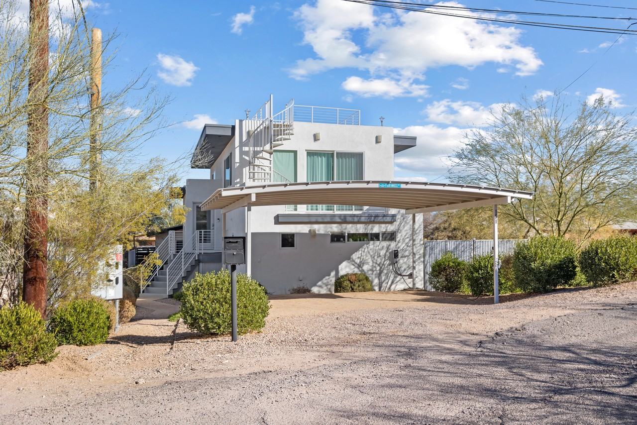 Simply Irresistible....Unique....Immaculate and Unfurnished! Walk in to your defined entry and upstairs to your spacious and bright family room, dining room and well appointed open kitchen. Windows all around to take in mountains, desert and city lights. Meander out to your deck to enjoy sunset, or wander up the spiral staircase to enjoy 360 degree views from the observation deck. Downstairs you will find the Owners Suite, Bedroom 2 and the Den/Flex Space. There is a laundry room complete with washer and dryer as well as a sink. Off of this level is a fenced private yard. EV car charger in the two car carport, solar, and well thought out design make this a magical place to live. CLOSE to Annex, Mercado, Street Car, A Mountain Tumamoc Hill, Downtown, +++! Truly a GEM.
