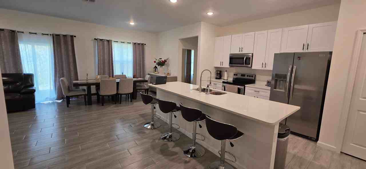 Experience the sophistication of new construction living. We invite you to explore this exquisite residence situated in Deltona, Florida, offering convenient access to retail establishments, dining options, and major thoroughfares. Upon entry, you will discover an expansive open floor plan featuring a generously sized kitchen island and a combined living and dining area. The four spacious bedrooms, each boasting elevated ceilings, provide a welcoming atmosphere. This property also includes the practicality of a two-car garage equipped with a full-sized washer and dryer. The sizable corner lot, free from rear neighbors, offers ample space for children or pets to enjoy. **Renting Fully Furnished or Not**