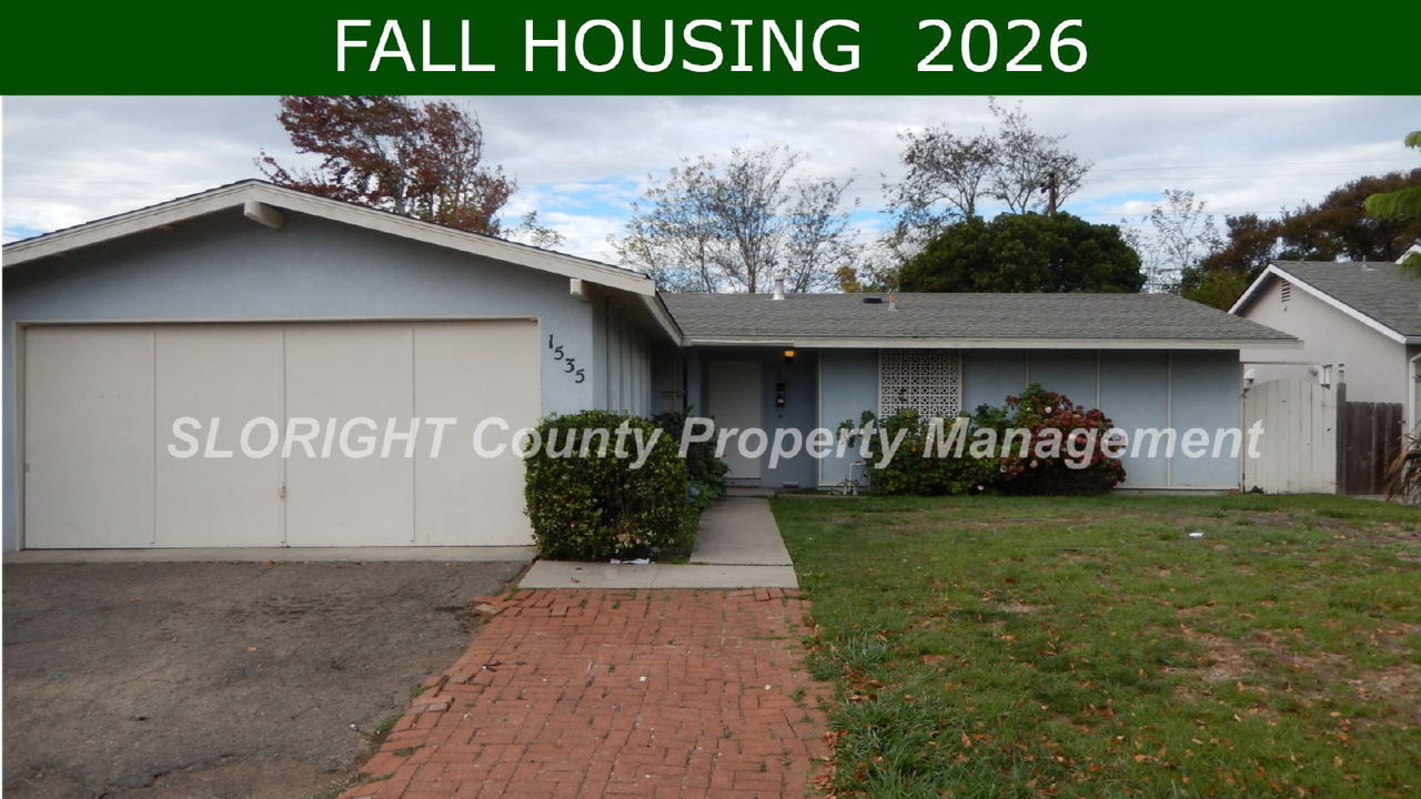 FALL HOUSING 2026 SEE FALL HOUSING FLYER: https sloright com students-fall-housing-2026 FALL HOUSING: Please note you MUST apply first to be considered for a showing. Tucked away in the Laguna Lake neighborhood, this lovely 3 Bed / 2 Bath home is situated on a large fenced lot. Inside, find a large family room centered around a brick fireplace with open flow into the kitchen and dining areas. Bedroom wing complete with two bathrooms, and a well-sized two-car garage wraps up the interior of this charming home. Public transportation near by! 12 month Lease. This is a NO PETS property. No smoking is allowed inside the home. The tenant is responsible for all utilities associated with the property. Gardener included. If selected as a tenant, a Move-in Fee of $49 per household is required. The fee covers a move-in inspection including digital records of property conditions for tenant protection. DO NOT DISTURB CURRENT TENANTS. A showing associate from our company must be present to show you around the home. We will not be doing open house showings for Fall Housing properties with tenants inside. If your group is chosen for a property, we will schedule a time where everyone in your group will have to view the property in person before a lease is written. Before submitting an application please carefully read the "Fall Housing Flyer" located at the top of the description and the "Rental Search" page. To apply, locate the advertisement of the property you are interested in under the “Rental Search” page and select “Apply Now” to begin. Newport Street, San Luis Obispo CA BRE Broker's License # 01876023