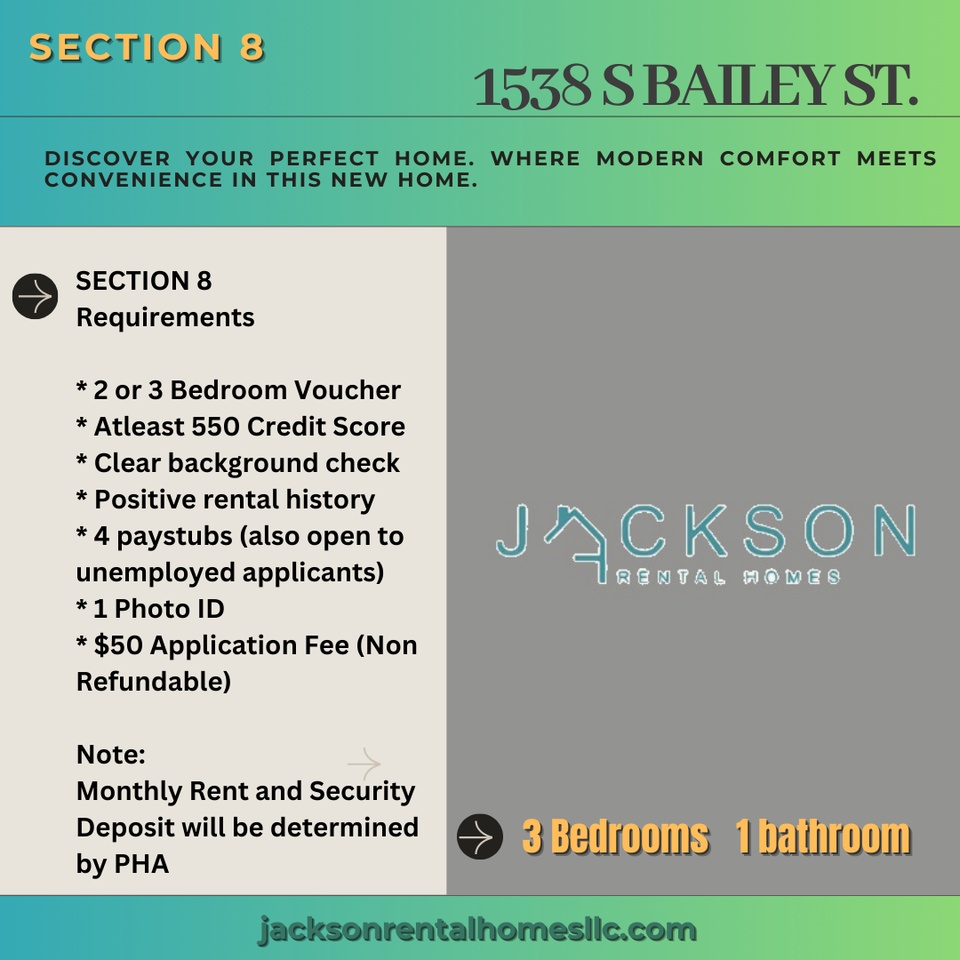 Welcome to 1538 S. Bailey St., a beautiful 3-bedroom, 1-bathroom home that offers both comfort and convenience, ideal for Section 8 applicants. This charming property is thoughtfully designed with spacious rooms, modern finishes, and a great location in the heart of South Philadelphia. Upon entering, you'll notice the recessed lighting throughout, creating a warm and welcoming ambiance. The home features radiator heat, ensuring a cozy environment during the colder months. The kitchen is equipped with sleek stainless steel appliances, making meal preparation a breeze while adding a touch of elegance to the space. Each of the three bedrooms is spacious and well-lit, offering ample room for relaxation and personal comfort. The tiled bathroom is designed with style and practicality in mind, providing a clean and modern feel. The backyard is perfect for outdoor activities or simply enjoying some fresh air, offering a private space for relaxation. Located in a prime South Philly area, 1538 S. Bailey St. is just a short distance from Vare Recreation Center, a great spot for community activities, sports, and outdoor fun. Additionally, families with school-aged children will appreciate the close proximity to James Alcorn School and Universal Audenried Charter School, both only a few blocks away. This home offers a blend of spacious living, modern amenities, and a fantastic location, making it the perfect choice for anyone looking for comfort and convenience in South Philadelphia. Don't miss out on this Section 8-approved gem—schedule your tour today and make 1538 S. Bailey St. your new home! Section 8 (Accepting 2 br voucher) Requirements * 2 or 3 Bedroom Voucher * Atleast 550 Credit Score * Clear background check * Positive rental history * Must be working cause will be asking 2 paystubs (If not, as many proof of income as you can provide.) * 1 Photo ID * $4.99 Application Fee (Non Refundable) Note: Monthly Rent and Security Deposit will be determined by PHA