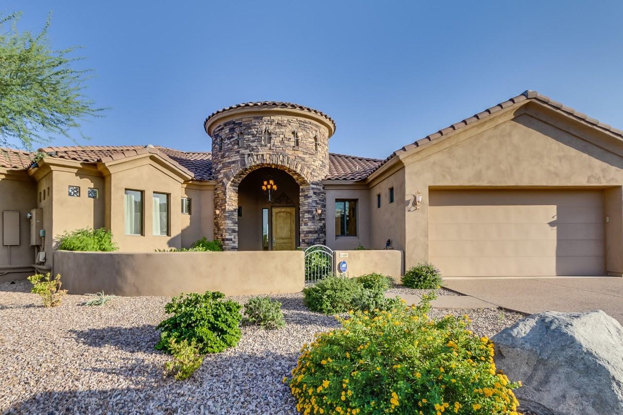 Wow, check out this partially furnished custom home on a premier street of Sunridge Canyon with incredible views from every room. Built in 2005 for a builders personal home, no expense was spared. Designed for single level living the main floor features no steps, a oversized master, two supporting bedrooms, and a hard to find FOUR CAR GARAGE! A charming courtyard greets guests royally. Step inside and notice rich woodwork and an open concept floor-plan. Open to the window lined living and dining room and wrap around deck, the kitchen is a true culinary paradise complete with stunning granite, knotty alder cabinetry, gas cooktop, stainless steel appliances, large breakfast bar, and a walk in pantry. Inspire tranquility from the split massive master retreat featuring endless views from a curved window lined sitting area, french doors providing private patio access, jetted tub, snail shower, walk in closet, and dual vanities including a makeup table. Take a step downstairs and find yourself in a family room featuring ample space and a fun wet bar perfect for entertaining. A second master retreat just as large as the first provides private patio access. A 5th bedroom is perfect for a gym and features a full en-suite. Perfect for every Sonoran season, two covered decks wrap around on each level and leads to the sparkling pool surrounded by lush landscaping and a garden. Hidden features of this home include surround sound, water softener, central vac, four car garage, and much much more! Do not miss the 3D video walk through!