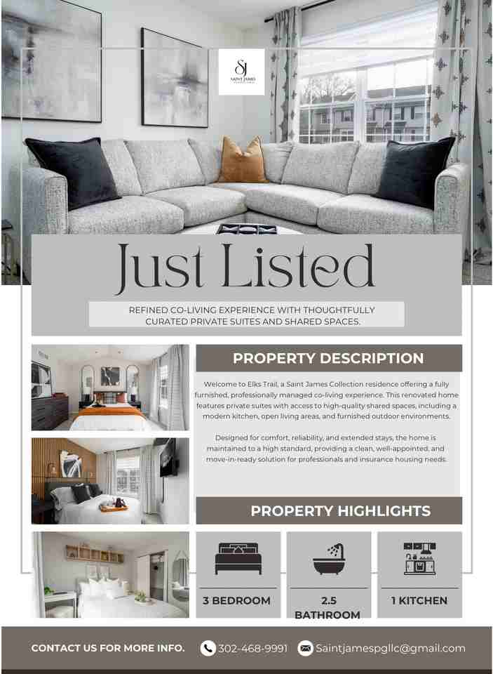Property Id: 2476592 Welcome to Elks Trail, a beautifully renovated and professionally designed residence within the Saint James Collection. This fully furnished 3-bedroom, 2.5-bathroom home offers a refined blend of comfort, style, and functionality—ideal for corporate professionals, traveling medical staff, families in transition, or insurance displacement stays. Thoughtfully curated by Interiors by Tamika, the home delivers a boutique hospitality experience with high-end finishes, modern amenities, and flexible lease terms. Key Features • Fully Furnished & Move-In Ready • 3 Spacious Bedrooms | 2.5 Bathrooms • Primary Suite with Private Bath & Deck • Professionally Designed Interiors • Dedicated Workspaces • Smart TVs in Each Bedroom • Premium Bedding & Blackout Curtains • Modern Kitchen with Stainless Steel Appliances • In-Unit Washer & Dryer • High-Speed Wi-Fi • Two Dedicated Parking Spaces • Furnished Outdoor Decks • Bi-Weekly Cleaning Available (Optional) ⸻ Bedroom Highlights • Primary Suite (Elks Retreat): Queen bed, private ensuite bath, private deck, and dedicated parking. • Softwood Suite: Queen bed with workspace and shared bath. • Noir Nook: Full-size bed, workspace, and shared bath—ideal for a single occupant. ⸻ Location Highlights Situated in New Castle, Delaware, this home offers convenient access to: • Christiana Hospital - approximately 10 minutes • Christiana Mall & Shopping Centers • Interstate I-95 - easy commuting to Wilmington, Newark, and Philadelphia • Local Parks and Dining Perfect for professionals seeking comfort and accessibility while enjoying a peaceful residential setting.