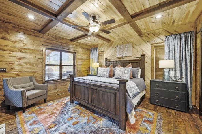 A well appointed, seven bedroom log cabin that offers high-end comfort surrounded by beautiful landscapes. Downstairs there\'s the king master bedroom with private access to the deck, TV with cable, en suite bathroom with shower and relaxing soaking tub. There are two more king bedrooms with private bathrooms. Laundry room with washer and dryer is also located downstairs. All bedrooms also have private baths. The loft has 2 queen over queen bunk beds, sofa, pool table, shuffle board, bar and balcony. The house is centrally heated and also has 2 fireplaces in living room and on the outdoor deck. There\'s also a kitchen that has everything you need. Cook your favorite meals or order from the restaurants nearby. Pets are welcomed with no additional fees. -- LID 45003496
