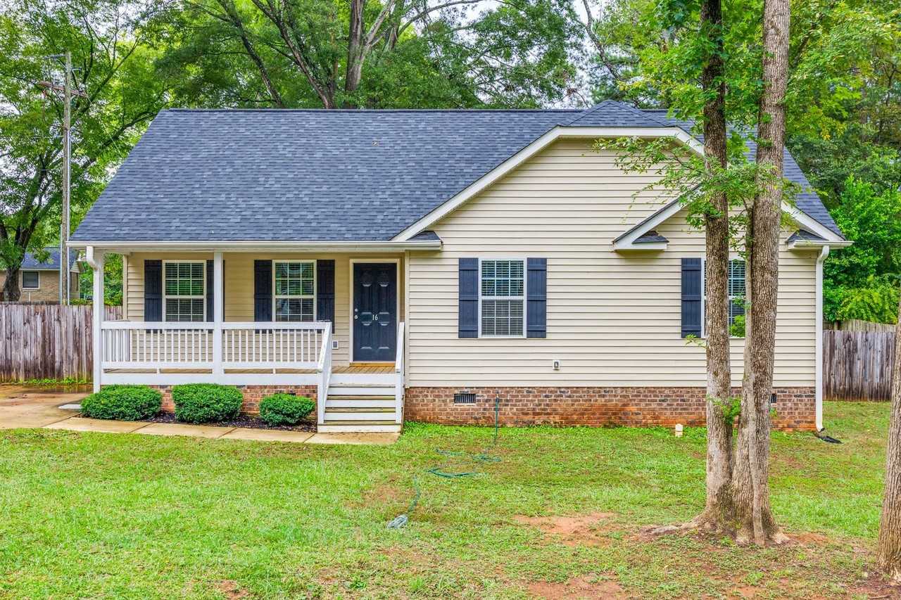 This delightful RANCH home is located close to historic downtown York, SC. Bright and neutral with a nice front porch. Luxury vinyl flooring in the main living areas, which is both pretty as well as practical. The eat-in kitchen offers dark espresso cabinets with granite counters, SS appliances, good storage & prep space, and a breakfast bar. The dining area opens to a large covered rear porch in a large, privately fenced backyard - perfect for indoor/outdoor entertaining. Vaulted Family Room. The Primary bedroom is accented by a tray ceiling with an ensuite full bath with granite counters. The two nice-sized secondary bedrooms share a full hall bath. The laundry room is next to the kitchen. A large driveway that can accommodate 3 vehicles. This home is a gem. Pets conditional. **No Cats**.