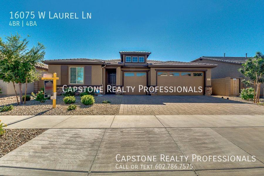 Gorgeous home located in Surprise AZ, conveniently near the 303 freeway. Built in 2018 this home still has a lot of living to do! Greeted into the home by a spacious open concept area with an expanded sliding glass door really giving the room more natural lighting, the main living room connecting into the kitchen and dining area. Accented with beautiful quartz counters, a large center island with a breakfast bar, walk in pantry, hooded stove and stainless steel appliances. The home features gorgeous laminate flooring throughout the common spaces and carpeting throughout the rest of the home. 4 bedrooms 3.5 bath with huge master bedroom, mother in law suite with wet bar and extra sitting room, a 3 car garage, and an extra den perfect for an office. Hurry and book a showing today. This home won't be available for long! -- Monthly Rental Tax Rate: 2.2% Monthly Tenant Benefit Package: $49.99 Security Deposit: Equal to one months rent Refundable Cleaning Deposit: $275.00 Refundable Pet Deposit: $200.00 per pet Carbon Monoxide Detectors Grass In Back Yard Smoke Detectors Vinyl Plank Flooring