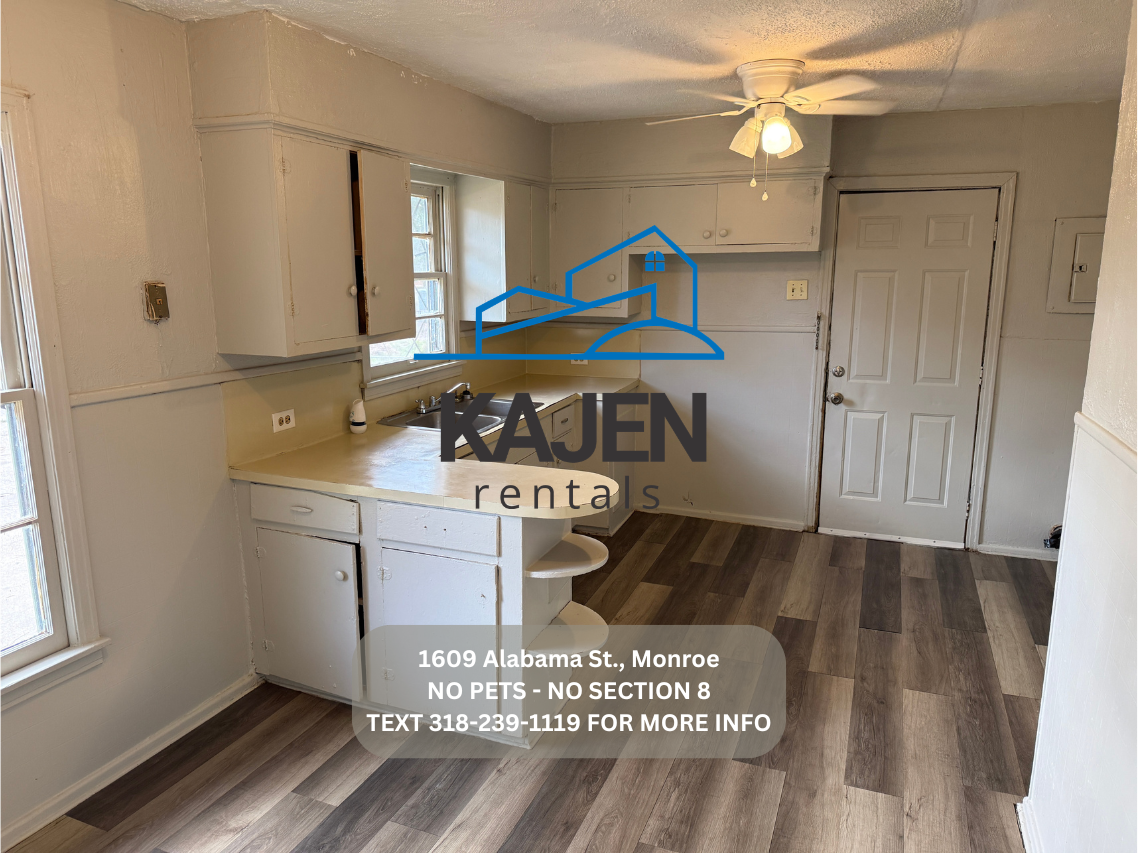-Text (318) 239-1119 "viewing instructions 1609 Alabama" We will then send you the instructions to do a self showing. - -No Pets -No rent to own -No smoking inside -Rent is $465.00 -Deposit is $400.00 -Income will be verified on each tenant. -Central Gas Heat. -Window AC unit. -Located at 1609 Alabama St, Monroe -You provide refrigerator and stove. -2 bedroom 1 bath home. -You pay utilities (water, electric, gas, trash, lawncare) -Washer and Dryer connections. -Home is electric and gas. -$50 application fee per adult.