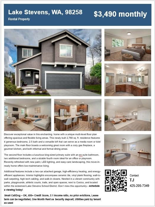 Discover exceptional value in this enchanting home with a unique multi-level floor plan offering spacious and flexible living areas. This newly built 2,768 sq. ft. residence features 4 generous bedrooms, 2.5 bath and a versatile loft that can serve as a media room or playroom. The main floor boasts a welcoming great room with a cozy gas fireplace, a gourmet kitchen, and both informal and formal dining areas. The second floor includes a luxurious king-sized primary suite with an en suite bathroom, two additional bedrooms, and a sizable fourth room ideal for an office or playroom. Recently refreshed with new paint, LED lighting, and easy-care landscaping, this move-in-ready home offers low-maintenance living. Additional features include a two-car attached garage, high-efficiency heating, and energy-efficient appliances. Interior highlights encompass ceramic tile, vinyl plank flooring, wall-to-wall carpeting, high-tech cabling, and walk-in closets. Nestled in a vibrant community with parks, playgrounds, athletic courts, trails, and open spaces, next to Costco, and located within the esteemed Lake Stevens School District. Don’t miss this opportunity—schedule a viewing today! Small Cat/Dog – OK, 680+ Credit Score, 3:1 Income ratio, no prior evictions, Lease term can be negotiated, One Month Rent as Security deposit, Utilities paid by tenant as used