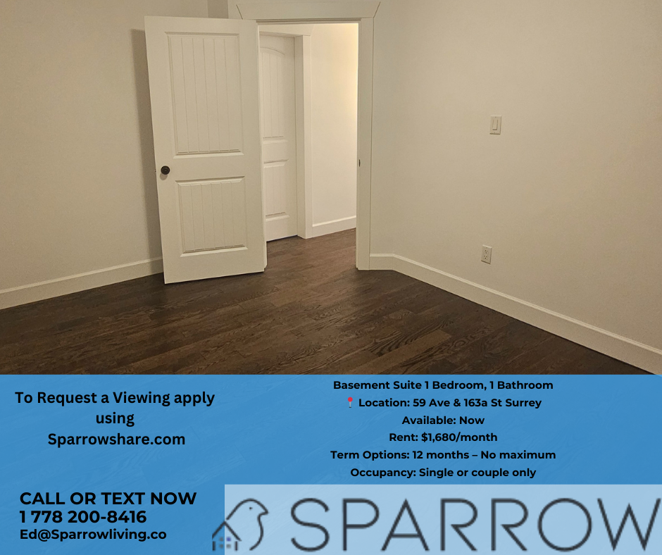 📩 Inquire Now: For the fastest response, text me at +1 778 200 8416 🏡 Basement Suite Available – 1 Bedroom, 1 Bathroom All About Andy's Home Welcome to this private and spacious basement suite located in a quiet, family-friendly neighborhood. This newly available unit includes 1 bedroom, 1 bathroom, a full kitchen, and a comfortable living space—ideal for individuals or couples seeking a peaceful and self-contained home. Enjoy the convenience of in-unit washer and dryer, high-speed internet, and separate entrance for added privacy. Perfect for long-term tenants looking for a welcoming and independent living space. References will be required. 🔑 About Bedroom A 📍 Location: 59 Ave & 163a St Surrey Available: Now Rent: $1,680/month Term Options: 12 months – No maximum Bedroom Type: Private Bathroom Type: Private Furnished: No Occupancy: Single or couple only Pets: Not allowed 🛠What This Home Offers Utilities & Amenities ✔️ Air Conditioning ✔️ Heating ✔️ Washer & Dryer ✔️ Internet Shared Items ❌ None – fully private basement suite Parking & Facilities 🚲 Bicycle Parking Available 💰 Payment Terms: Security deposit required after signing the agreement First month’s rent must be paid before move-in date Security deposit refunded at the end of the lease (conditional on the property being left in its original condition, minus normal wear and tear) 📜 Application Requirements: Copy of ID If Student: Proof of enrollment If Employed: Proof of employment and/or income Minimum 2-month rental agreement First month’s rent + security deposit required Non-smoker, preferably a student or a professional Additional Benefits: ✅ Tenant Insurance Included: Renting through Sparrow includes tenant insurance at no extra cost, providing you with added peace of mind. ✅ Credit Building: Your rent payments through Sparrow will be reported to credit bureaus, helping you build and improve your credit score. 📢 Disclaimer: This listing has been syndicated from SparrowShare.com, including its content, rental terms, and images. Sparrow verifies the identity and compatibility of applicants. The advertised property is owned and/or managed by Ed from Sparrow Living Inc.
