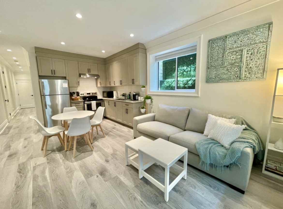 Nightly, weekly, and monthly rates available. Fully furnished. Enjoy your stay in our bright and centrally located brand new two bedroom private suite with all new and modern furnishings. Unwind in the living space on the extra deep comfortable sofa with a large 65 inch Sony tv with access to cable that has a bunch of extra added channels, Netflix, amazon prime, and Disney +. Relax with the essential oil diffuser and a variety of scents from Saje. The kitchen has a full size fridge and stove, and is packed with all the essentials including pots and pans, dishes, microwave, toaster, bakeware, electric kettle, chopsticks, rice cooker, wine glasses, Tupperware, a wide selection of spices, as well as an amazing selection of premium nespresso coffees and tazo teas. Both bedrooms have brand new queen size Sealy tempurpedic mattresses and box springs, extra cozy pillows, soft sheets, an alarm clock with plug in for phone cord, an iPhone charger, hangers, a lamp and beautiful artwork. One of the bedrooms also has a desk and desk chair. The bathroom has a tub/shower with soaps, shampoo/conditioner, and body lotion supplied. The private outdoor space has a cozy sofa and string lights- the perfect place to enjoy a cup of tea or a glass of wine. In suite extra large washer and dryer with laundry detergent supplied. Free street parking on side street. About us: We are a respectful professional family and strive to excel as your hosts. We are new at this- so if there’s anything you think we should add to the place or anything we could do to make your stay perfect and earn your 5 star review, please reach out during your stay. I’m a stay at home mom with two year old and four year girls and an adorable goldendoodle, so there is definitely some household noise during the day- that being said, they nap from about 12-2, and are in bed by 7. We have a zero tolerance policy for drugs or smoking on our property, no parties, and appreciate not being very loud at night, to be respectful to our neighbors (and to make sure our kids sleep because any parent knows how important that is, lol!) Although we generally do not accept pets, I have set this listing as accepting pets because we will make exceptions depending on the demeanor of the pet, how noisy it is, if you let it on the bed or sofa, if it has long shaggy hair, etc. Note that there will be an additional 25$/night pet fee if we decide to make an exception Please note daily/weekly rates available as well.