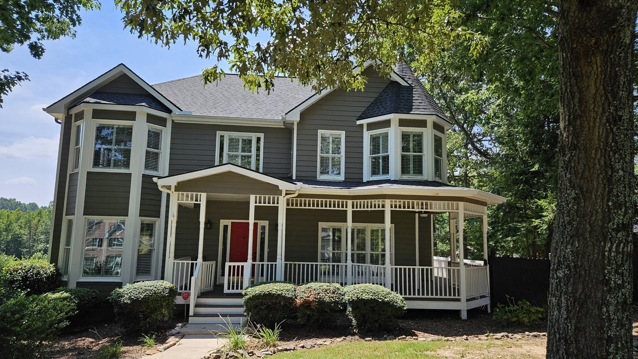 LOCATION AND LOT! Picture perfect 4 bed 2.5 bath Victorian Charm in the coveted Shiloh Point/South Forsyth School District! Make this house your home with true wrap-around porch and bay windows on a beautifully landscaped large corner lot on a quiet cul-de-sac with fenced backyard. Grill out and relax on the back deck with a bird's eye view of the tremendous shade trees, stone fire pit, and beautiful pink flowering cherry trees surrounding the cul-de-sac. This home is move-in ready with finished basement and has been recently updated with new roof, hardwood floors throughout the main level, agreeable grey interior walls, new deck, new exterior paint, and new carpet upstairs. Plantation shutters adorn windows throughout. Eat-in kitchen boasts granite countertops, tile backsplash, center island, and stainless-steel appliances. Washer and dryer are provided as well as large Samsung 4K Smart TVs in the master bedroom, family room and eat-in kitchen. Low utility costs with efficient electric heat pump hybrid water heater and septic tank.