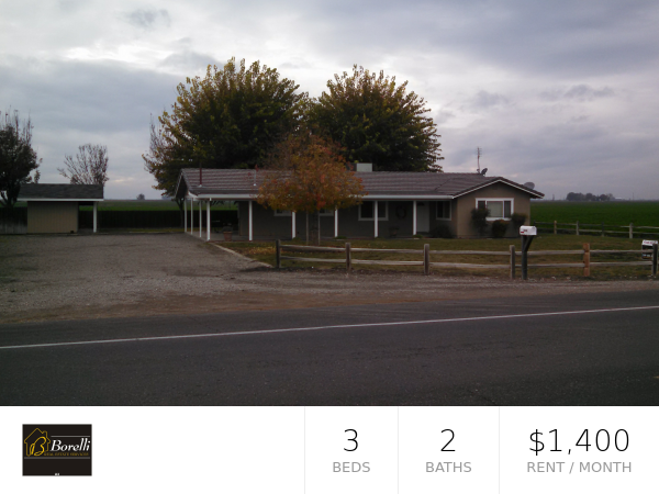 Beautiful 3 bedroom 2 bath country home! Property Address 16843 State Hwy 33 | Dos Palos, CA 93620 Available: 08/17/2019 Offered By Borelli Real Estate Services Description Beautiful house in the country yet easy access to Hwy 152. 3 bedroom 2 bath home with approximately 1800 square feet of living space. This home features newer exterior paint, central heat and air, tile in the bathrooms, large kitchen, Living room, and a large open backyard. Plenty of room for all of your toys. Owner pays for yard care. THIS IS A MUST SEE!!!! $1400 a month rent plus $2500 security deposit. Outside Pet strictly negotiable with $500 increased security deposit. Non-Smoking property. Don't let this pass you up! From hwy 152. South on Hwy 33, House is on the right. Applications on website (www.brehome.com). SCHEDULE SHOWING. Do not disturb tenants. Property will be available mid August. Visit www brehome com for more info on this property, other rentals, and pictures of this great property or call Borelli Real Estate Services (Property Management Company) 1(209) 485-9273 ext. 3 for more info. Details * Beds/Baths: 3BD/2.0BA * Square Feet: 1,700 Rental Terms * Rent: $1,400.00 * Available: 08/17/2019 * Application Fee: $35.00 * Security Deposit: $2,500.00 Contact us to schedule a showing.