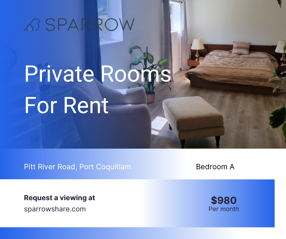 *Text me at 437 291 7980 for assistance using SparrowShare 250 SF Private Suite , Private Washroom (Females Only) Near Douglas College Nearest Bus Service: Northbound Holly Dr @ Sorrel St: Approximately a 5-minute walk from the property. Some more info: (Open for female or couple) Bedrooms available: 2 Private Rooms Bedroom A: $980 Private room and Private bathroom (Queen Bed) Bedroom B: $980 Private room and Shared bathroom (Double Bed) Shared spaces: Backyard, Kitchen, Patio, Dining Room, Living Room, Balcony Furnished: Yes Utilities/Amenities: Air Conditioning, Cable TV, Heating, Washer, Dryer, Internet Parking: On Premise and Free on the Street Address: Pitt River Rd, Port Coquitlam, BC V3C 1P5, Canada Minimum rent term: 4 months Pets: Not allowed Payment: Security deposit after signing the agreement, then pay the 1st month's rent before move in-date Additional Benefits: - Tenant Insurance Included: Renting through Sparrow includes tenant insurance at no extra cost, providing you with added peace of mind. - Credit Building: Your rent payments through Sparrow will be reported to credit bureaus, helping you build and boost your credit score over time. Requirements: Copy of ID Credit Check If student, proof of enrolment If employed, proof of employment and/or income min 4 months rental agreement First month and rent deposit required Disclaimer: This listing has been syndicated from sparrowshare.com, including its content, rental terms, and images. Sparrow is used to verify the identity and compatibility of those interested. The advertised property is owned and/or managed by Melvin from Sparrow Living Inc. For more information, feel free to reach out at 437 291 7980. Message me with your name, when you were looking to move, how long you were looking to stay, and a bit about you.