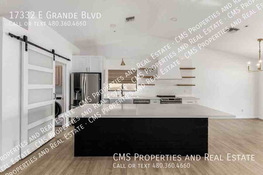 Wow! You'll love this remodeled Fountain Hills home with an updated/modern foorplan and finishes. Step inside to a fully-open great room that is light and bright. The kitchen is fantastic with large island, quartz counters, shaker cabinets, modern open shelving, farmhouse sink, reverse osmosis system and custom vent hood and lighting. The vaulted ceilings in the area help the home to feel large and airy. Off the great room is a covered patio that leads to the fenced pebble-sheen pool and large yard with low maintenance artificial turf. Back inside, you'll love the primary suite with it's access to the backyard and ensuite bath complete with dual vanity, updated lights, faucets, mirrors and large custom walk in shower. This bedroom also boasts a walk-in closet with custom shelving. The two guest rooms are a great size and feature updated lighting and feature walls. The guest bath has an updated vanity and tub/shower combo. This property also features an RV gate with room for RV parking or parking for other "toys" behind the gate. All this plus a 2 car garage. hard surface flooring throughout and all appliances included. Rent also includes landscape and pool service. Application fee is $60 per applicant. $20 per month tenant admin fee. $200 re-key fee at move in. No smoking allowed. One dog under 25 pounds may be accepted with landlord approval. Pet application fee is $30 per If a pet is approved non-refundable pet fee is $250. View today before it's gone. Luxury Vinyl Plank Quartz Counters Rv Parking Washer/Dryer