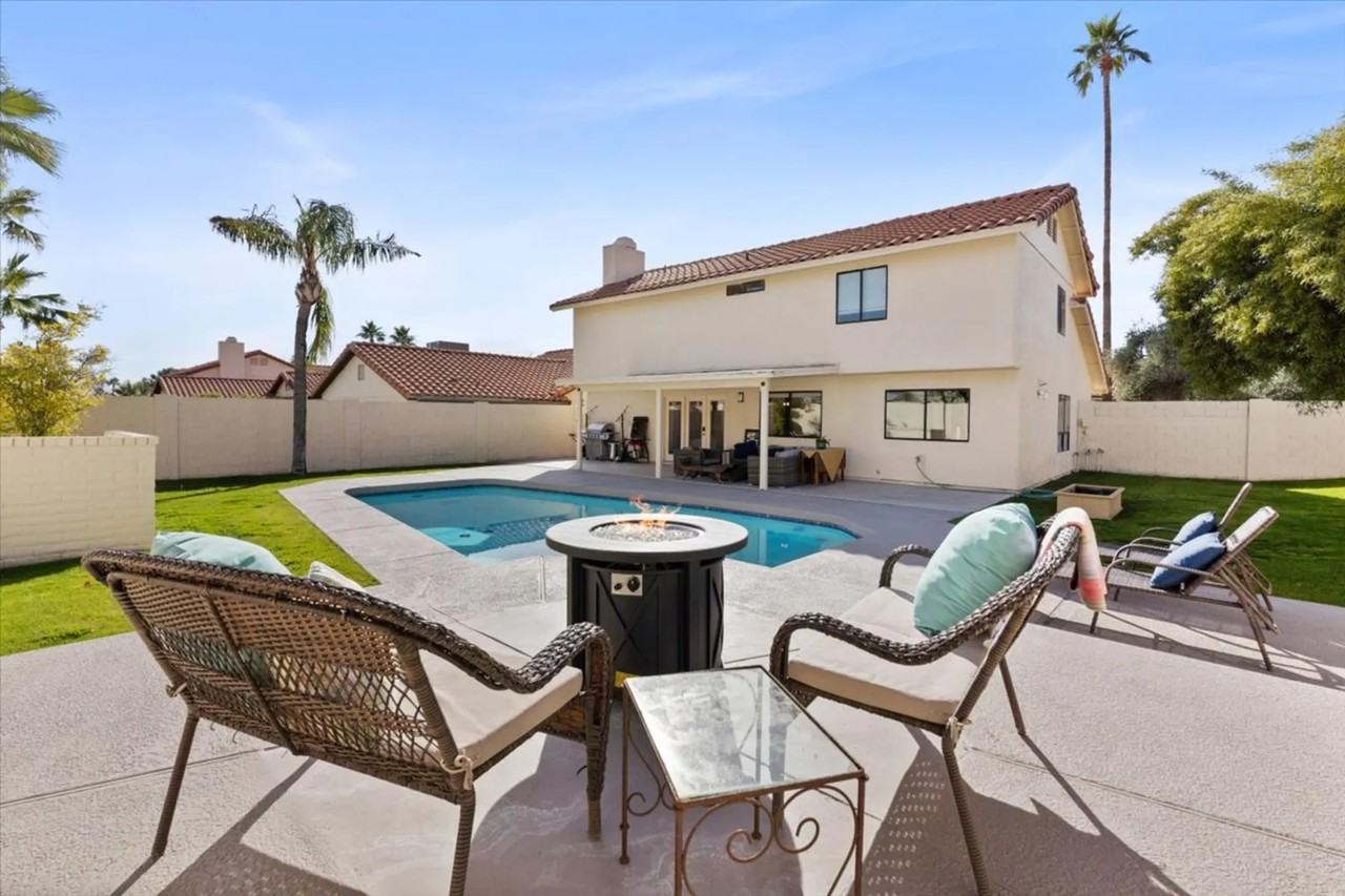 Welcome to your modernly remodeled completely furnished home situated in safe and clean neighborhood. The three bedrooms are all upstairs. The master bedroom is spacious with a king size bed, sitting area, desk and flatscreen TV. The master bathroom has two sinks and a walk in multi-head shower. The other two bed have queen beds and walk in closets. The bathroom had two sinks and a travertine shower and bath. The newly remodeled kitchen with granite waterfall countertops, new appliances and fully stocked kitchen for cooking and entertaining. The open floor plan is expansive with a kitchen sitting area and dining table that flows into a sitting area with a wood burning fireplace and 50" television. The other bar area opens into a sitting area with a pool table and 70" flat screen television. Walk into your private resort like backyard and enjoy the diving pool and covered patio with outdoor furniture. The house is .5 miles to a Starbucks, one mile to Tempe Town Lake with lots of restaurants and breweries. Papago Park is right across the street for a gorgeous sunset walk or bike ride. Phoenix Sky Harbor is five miles from the house!
