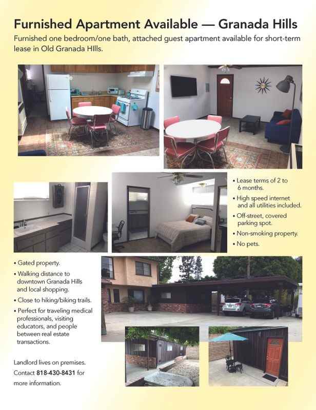 Fully furnished one bedroom/one bath, attached guest apartment available for short-term lease in Old Granada Hills • Gated property • Close proximity to downtown Granada Hills, local shopping, hiking & biking trails • Easy access to the 118, 5, & 405 freeways • Perfect for traveling medical professionals, visiting educators, and people between real estate transactions • Lease terms of 2 to 6 months • High speed internet and all utilities included • On site, covered parking spot. • Non-smoking property • No pets