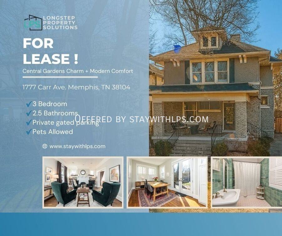 This beautifully preserved 3-bedroom, 2.5-bathroom home in the heart of Central Gardens blends historic character with fresh updates and flexible living space. Interior: Original hardwood floors throughout, tall ceilings, and generous natural light. Multiple living areas include a large front room, a cozy den, and a separate office. The kitchen features stainless appliances, gas stove, island with bar seating, and eat-in breakfast space. Upstairs, all three bedrooms offer ample storage, with the primary suite featuring a private bath. Updated fixtures and a half-bath downstairs add convenience. Exterior: Located on a quiet Midtown street with mature trees and timeless curb appeal. Bricked patio offers the perfect space for entertaining or relaxing. Private gated parking plus a deep front porch ideal for enjoying the neighborhood. Mechanical: Central HVAC, updated electrical and plumbing, gas water heater, and efficient layout for year-round comfort. Quiet pets welcome!
