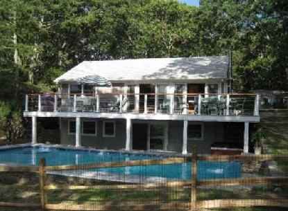 Wonderfully renovated four bedroom, three bath contemporary is located on a country road in Westhampton. House features new kitchen, four bedrooms, three and a half baths, expansive deck and large heated pool. Very serene surroundings. Relax and enjoy your summer in this truly peaceful waterside home. Private boat dock. Use of tennis two houses away.