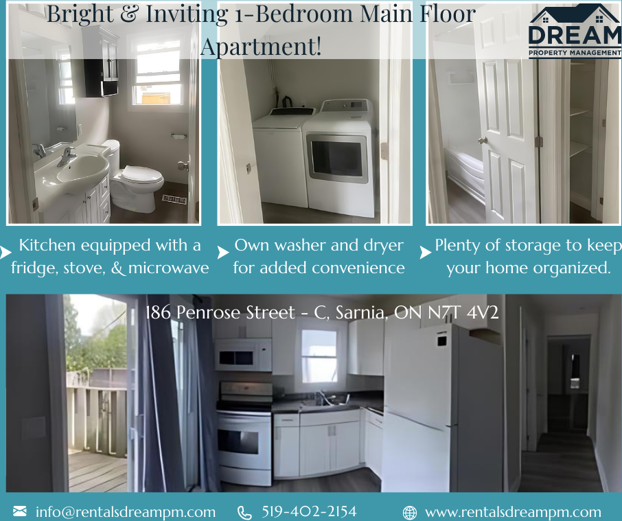 Bright & Inviting 1-Bedroom Main Floor Apartment! Welcome to your new home, where comfort meets convenience. This charming 1-bedroom apartment on the main floor is filled with natural light and offers all the essentials for easy living. Here's why you'll love this: - Abundant Natural Light: Enjoy a bright and airy atmosphere throughout the apartment. - Spacious Living: Generous living room and bedroom space for your comfort. - Modern Kitchen: Equipped with a fridge, stove, and over-the-range microwave, plus a patio door leading to your private patio—perfect for morning coffee! - New Vinyl Flooring: Fresh and stylish flooring throughout the entire space. - Ample Storage: Plenty of storage to keep your home organized. - Private Laundry: Your own washer and dryer for added convenience. - Assigned Parking: One designated parking spot just for you. - Non-Smoking Building: Ensures a clean and healthy living environment. - Shared Outdoor Spaces: Enjoy common areas outside for relaxation and socializing. - All Utilities Included: Tenant only pays for internet. Requirements: - First and last month's rent - Tenant's insurance - Credit check and references - Online application completed at www rentalsdreampm com Don't miss out on this cozy and convenient living space! Apply today to secure your spot! Email: **** Phone: 519-402-2154 Submit Online Application: www rentalsdreampm com Unit amenities Dryer, Heat, Microwave, Private patio, Refrigerator, Stove and oven, Washer