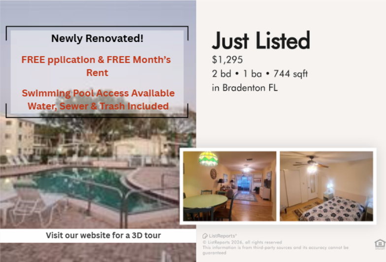 *** FREE APPLICATION & FREE MONTH'S RENT *** For any questions regarding the property or the rental process please call or text (727) 666-5388 Beautiful 2 beds 1 bath is available for rent in Bradenton, FL. with 10 Stars Property Management Welcome to 1874 Sunny Drive, Unit F32 in Bradenton, a conveniently located rental offering comfort, accessibility, and easy access to Florida's Gulf Coast lifestyle! Situated just minutes from shopping, dining, and everyday conveniences along Cortez Road West, this home also provides quick access to outdoor recreation at GT Bray Park and waterfront relaxation along the scenic Bradenton Riverwalk. Spend weekends soaking up the sun at the beautiful shores of Anna Maria Island or exploring local dining and entertainment throughout Bradenton. With convenient access to major roadways connecting you to Sarasota and surrounding Gulf Coast communities, this Bradenton home offers the perfect blend of comfort, convenience, and coastal living. Features: - Application fee will be credited back on the 1st month of rent if approved - Well established 55+ community - Conveniently located on the 3rd floor - Fully furnished home for move in ready experience - Laminated hardwood floors adding warmth, durability, and timeless elegance - Basic kitchen appliances for everyday cooking convenience - Ceiling fans for year round comfort and airflow - Washer and dryer included for ultimate convenience - Inviting bathtub for a relaxing soak after a long day - Building features an elevator for convenient access to all levels - Assigned parking for guaranteed convenience and easy access - Access to community pool for leisure and enjoyment - Water, sewer & trash included - Tenant is responsible for power - Part of an HOA Community No pets allowed per HOA rules. Does not apply to medically/emotional support prescribed and/or service animals. Details on our website: https 10starshomes com rental-guidelines Every applicant 18 years of age or older is required to complete a separate application. Each application is a $65 non refundable fee. A credit and background check will be conducted for all applicants, and management approval is required prior to signing the lease. See all rules and regulations at https 10starshomes com rental-guidelines All residents are automatically enrolled in the 10 Stars Resident Benefits Package at a cost of $7.99 per month. This program was developed to enhance the overall rental experience by providing added convenience, protection, and value throughout the lease term. Enrollment is required and cannot be waived. The package may only be initiated at the time of lease signing or renewal and includes a range of benefits designed to promote a more efficient, flexible, and secure tenancy. Renter's insurance required prior to move-in. Please see the link below for more details: https 10starshomes com resident-forms Renter's insurance required prior to move-in. You may obtain coverage through our third-party provider, Beagle, for $12/month, which includes $100,000 liability coverage and $5,000 in personal property coverage. Please see the link below for more details: https 10starshomes com resident-forms At 10 Stars, we offer multiple services to make your stay with us easy and comfortable. We have a same-day application approval and a quick move-in for no additional cost. Our team is professionally trained and will be able to assist with any leasing, billing, or maintenance issues our tenants hav..
