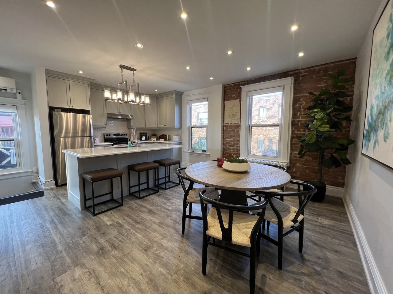 Newly renovated two bedroom apartment in the heart of Little Italy. This apartment is located on the second and third floor of a renovated victorian house. The first floor of the apartment boasts a spacious eat in kitchen with an island, a lovely living room with bay window and a powder room which also houses the washer and dryer. On the second floor, there are two spacious bedrooms and a main bathroom with double sinks and a bathtub/shower. The apartment has lots of natural light and exposed brick accents that add to its unique charm. Steps away from College St. shops, restaurants and transit.
