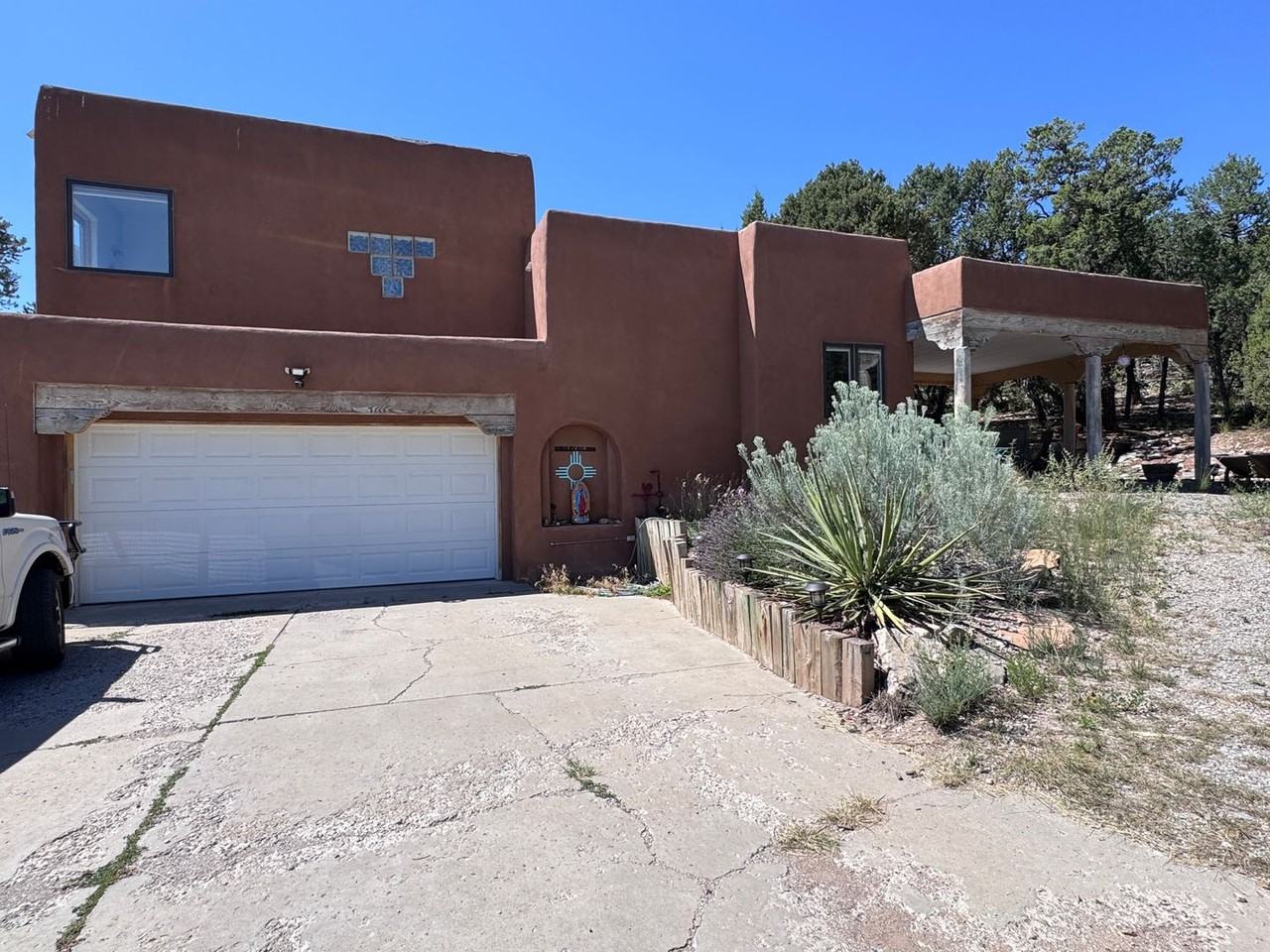 Pretty pueblo in the pines. This home offers end of the road privacy. High ceilings and tile floors give the living room a spacious feel. Custom southwestern cabinetry in the kitchen, stainless steel appliances. Large laundry room. Cozy den with bar. Two covered patios to enjoy the outdoors. Two bedrooms and bath on main level, treetop master suite with large walk-in closet and bath with soak tub. Two car garage and extra storage shed. Available now. Prospective tenants must call property manager before submitting application, Liz Mazzola (505) 250-1250.