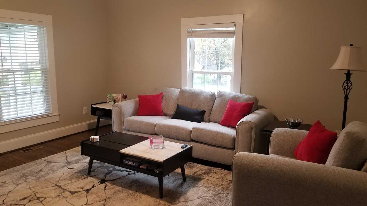 Welcome to Penne Place, a fully remodeled and FULLY FURNISHED 2 bedroom, 2 bathroom home, located within walking distance of the Village of West Greenville. Flexible lease terms, as short a 1 month to 12+ months. Penne Place is only 2 miles from the heart of Greenville's downtown as well as Unity Park. Both bedrooms have queen beds and there is a pull-out queen sofa in the living room for weekend guests. The kitchen has all you need to make a full meal and there is an eat-in dining table that can accommodate up to 6 people. Enjoy the spacious back yard, grilling and eating out on the back deck, or head out front and relax on the front porch. The living room has a smart TV. The fireplace in the living room is ornamental only, please do not use. The home also has a washer and dryer. Utilities are included for furnished rentals, including internet. There are driveways on both sides of the home, for parking up to 3 cars, including 1 car inside the gate. Please note that the garage in the backyard is not available for use by renters. Pets will be considered with an additional $250/pet one time fee.