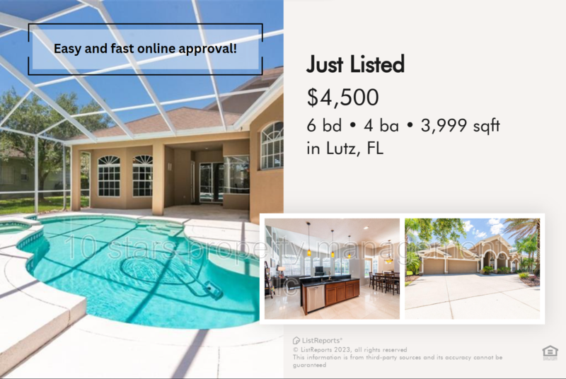 ** New listing with 10 Stars Property Management ** For any questions regarding the property or the rental process please call or text (727) 666-5388 Beautiful 6 beds 4 baths is available for rent in Lutz, FL. The surrounding area offers access to the natural beauty and recreational opportunities of the nearby Lake Park and Brooker Creek Preserve. Lake Park features walking trails, a fishing dock, and a playground, while Brooker Creek Preserve offers nature trails, wildlife observation, and opportunities for birdwatching. Residents can also enjoy the nearby attractions of the Tampa Premium Outlets, a popular shopping destination with a wide range of retail stores and dining options, and the Florida Hospital Center Ice, a premier ice sports facility. For outdoor activities, the location is close to the Upper Tampa Bay Trail, a scenic trail for walking, jogging, and biking. In terms of transportation, the nearby major road, State Road 54, provides convenient access to other parts of Lutz and the wider Tampa Bay area. Features: -Tiled floor for a stylish and easy-to-maintain surface -Washer and dryer included for convenient laundry needs -Larger dining and living room areas for comfortable entertaining -Stainless steel kitchen appliances and a kitchen island for a modern and functional kitchen -Window coverings for privacy and light control -Screened-in Pool lanai for enjoyable outdoor relaxation -Exclusive access to a community pool, clubhouse, and tennis courts -Zoned for McKitrick, Martinez, and Steinbrenner schools, offering excellent education options -Abundance of natural light for a bright and welcoming atmosphere -Tenant responsible for covering the costs of utilities -Pet friendly (with no aggressive breeds) and requires a $150 pet deposit. -HOA community, applicants must apply with them as per their guidelines. At 10 Stars, we offer multiple services to make your stay with us easy and comfortable. We have a same-day application approval and a quick move-in for no additional cost. Our team is professionally trained and will be able to assist with any leasing, billing, or maintenance issues our tenants have. We also offer an emergency line available 24/7 for any urgent cases. Tenants have access to an online portal where they can make rent payments, communicate with our team and get updates on their payments and maintenance requests at all times. THE FIRST MONTH AND SECURITY DEPOSIT ARE REQUIRED We do offer a TENANT BENEFIT PACKAGE and a DEPOSIT FREE MOVE IN. Details on our website: https 10starshomes com move-in-without-a-deposit Renter's insurance is required prior to moving in. Rules and Regulations are on our website! www 10starshomes com Only $65 non-refundable application fee per adult with 10 stars property management