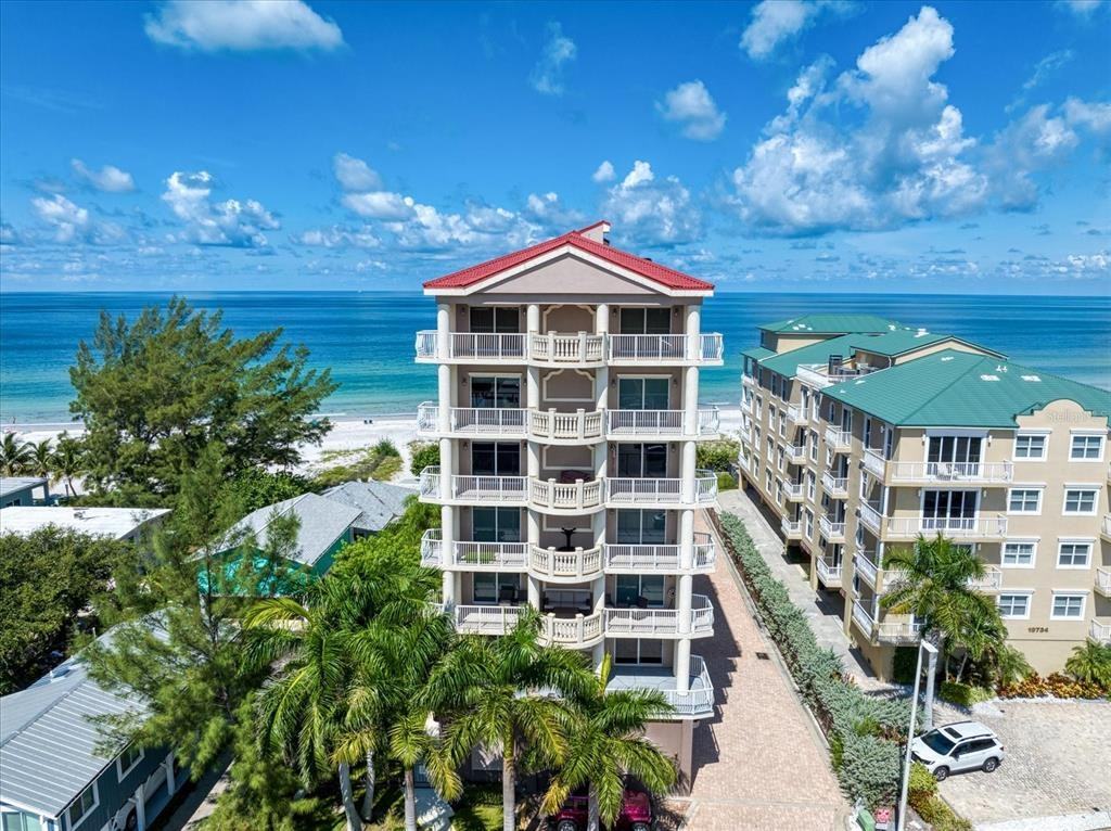 Don't miss this rare opportunity to immerse yourself in superior waterfront living in this 5,100 sq ft condo that lives just like a house. The oversized 2+ car garage has a loft for storage, a Tesla charger and an entrance into the building to avoid inclement weather. A secure elevator will take you to your private lobby and inside the wonderful open concept is arranged to perfectly frame the mesmerizing and sweeping Gulf and sunset views. The enormous kitchen features 2 islands, wood cabinets, granite counters, a wine fridge, pot filler, gas cooktop and stainless steel appliances, a separate Butler's pantry with full sized fridge and an amazing oversized walk-in pantry. The luxurious master retreat boasts a lovely sitting room and terrace with stunning views, a beautiful ensuite with his, her and extra closet space plus a double sink vanity, double walk-in shower and jetted tub. This is also the only unit in the building with direct access to the pool and spa. The split bedroom plan offers privacy for the additional 4 guestrooms, each with a terrace, including another primary bedroom and ensuite with a huge front terrace overlooking the quiet town of Indian Shores. Additional features to this perfect beach retreat include 2 new TRANE A/C units, 9 ft ceilings throughout, Travertine floors, tray ceilings with lighting, all terraces have refinished floors, built-ins, an in-unit trash shoot, dog run and so much more. Ideally located, don't wait to experience Florida at its finest!!