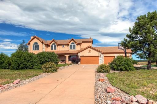Beautiful Kings Deer 2-story in area of fine luxury homes. Situated on 2.52 acres this custom home features a dramatic two story foyer with curved stairway, hardwood floors and arched entry into living area with gas fireplace, crown molding, large formal dining with crown molding perfect for large family gatherings. The cheerful gourmet kitchen boast granite counters, stainless steel appliances, veggie sink and gas range top in huge center island w/ breakfast bar to enjoy company while cooking, recess lighting, Cherry cabinets, pantry, planning desk, hardwood floors and bayed breakfast nook. Spacious great room off the kitchen area with stacked stone fireplace and gleaming hardwood floors walk’s out to a beautiful deck to enjoy the Colorado evenings. Notice the thoughtfully placed Pella windows throughout the house that perfectly frame the Front Range and Pikes Peak views. Upstairs features a vaulted master suite w/ sitting area, gas fireplace, walk-out to private deck, large walk-in closet, adjoining 5 piece master spa, jetted tub and glass block shower w/ dual shower heads, three additional secondary bedrooms & 2 full baths complete the upper level. Walk-out lower level w/ family room w/ stacked stone fireplace, rec room, large office or 5th bedroom and bath. Convenient main level mud room, laundry w/ utility sink, central vac, intercom system, security system, pre-plumbed for a/c, newly refinished hardwood floor, warm and neutral new paint in kitchen, great room, lower family room and rec room this week-& so much more! Colorado living at its finest!