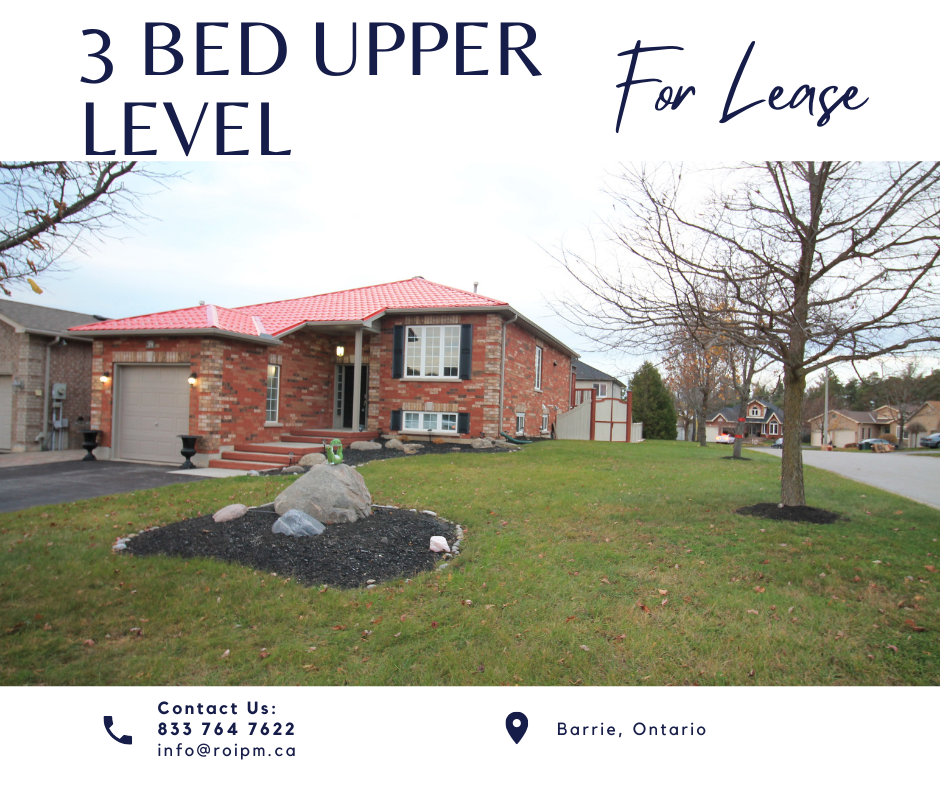 $2,250 plus 55% utilities, 3 bed 1 bath upper level unit available December 1st. Located in a quiet and friendly neighbourhood, this home is tucked on the outskirts of Barrie in the Highway 27/Ardagh area. Only a 10 minute drive to Highway 400. This location is ideal for anyone who is looking to live close to town’s necessities while also feeling that you are secluded from the hustle bustle of the city. This unit offers one parking space in the garage and one parking space in the driveway. When you enter this home, you are greeted by a large entry space with a full sized closet, conveniently with double mirrors. A staircase going up as well as a stair case going down sits in the entry way. As you go up the stairs, the spacious living area provides a ton of bright and natural lighting casting from the large windows. This is a great space for larger furniture such as a sectional. A cool additional feature is the rare shelving in the living area that offers spot lighting, showcasing your favourite items. The kitchen is recently renovated with beautiful marble counter tops, stainless steel appliances and contemporary wall design. There is an island with a breakfast bar as well as enough space for a small dining table in the kitchen. New light fixtures offer great lighting in the kitchen as well. Just off the kitchen, there is a sliding door that invites you to a large balcony that overlooks the beautifully landscaped back yard. This is an ideal spot for entertainment in the warmer months. In this upper level unit there are 3 bedrooms on the main level. Each bedroom is a great size with plenty of closet/wardrobe space. The bathroom at the end of the hallway is recently renovated with a full sized shower and bath tub combo as well as double sinks on the vanity. The bathroom and kitchen provide a more modernized feel. As you go down the stairs that are located in the entry way, the utility room is at the bottom of the stairs. As well as in unit laundry. This home is a great opportunity for a couple or working professionals. There is lots of opportunity for extra storage. Message us for more details!! We look forward to hearing from you! ☺️