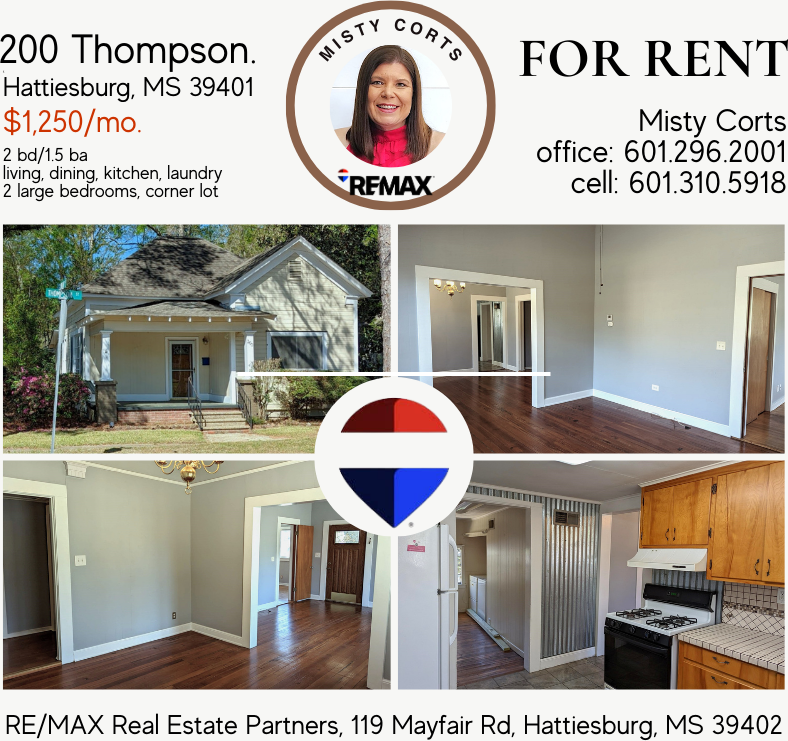 200 Thompson St. - Charming downtown Hattiesburg Cottage 2bd/1.5 ba $1250/mo.; $1250 dep. Do you want to be walking distance from the library, Thirsty Hippo, the Porter and all things Downtown Hattiesburg? This is the spot for you. This 2bd/1.5 bath home has high ceilings and lots of charm. The living room and dining space are open. The 2 bedrooms are adjacent to the living space with a half bath in between. The full bath is on the hallway and has nice bright lighting. The kitchen is spacious with lots of fun accents including a lazy susan. The laundry is spacious and includes a washer/dryer. The back yard has a small fence and a storage building. What a great space in the heart of Hattiesburg! Appliance: refrigerator, range, washer/dryer Utilities: Tenant is to provide. Mississippi Power, City of Hattiesburg Available date: NOW Lease term: one year required Hold time for move-in: no more than 2 weeks from available date School District: Hattiesburg PETS: By owner approval, no puppies, aggressive breeds, or large breeds Covered Parking: no, private driveway Fenced yard: yes Renters Insurance: required Scheduling: text(preferred) or call listing agent during normal business hours (don't forget to include the address in your message please) Requirements: Monthly income (verified by pay information) equivalent to a MINIMUM of 3 times the monthly rent and reasonable credit. ALL adult occupants must complete the application process ($40 per person). Rental history or home ownership verification is also required. PLEASE DO NOT APPLY WITHOUT VIEWING THE PROPERTY FIRST. If local, please drive by before calling to schedule an interior viewing and make sure the lot size and location work for your needs. | Professionally Managed By: Misty Corts, Broker Associate with RE/MAX Real Estate Partners | mobile: 601.310.5918 | office: 601.296.2001 | www HattiesburgRentals com | 119 Mayfair Rd Hattiesburg, MS 39402. Misty Corts, Broker Associate & Property Manager