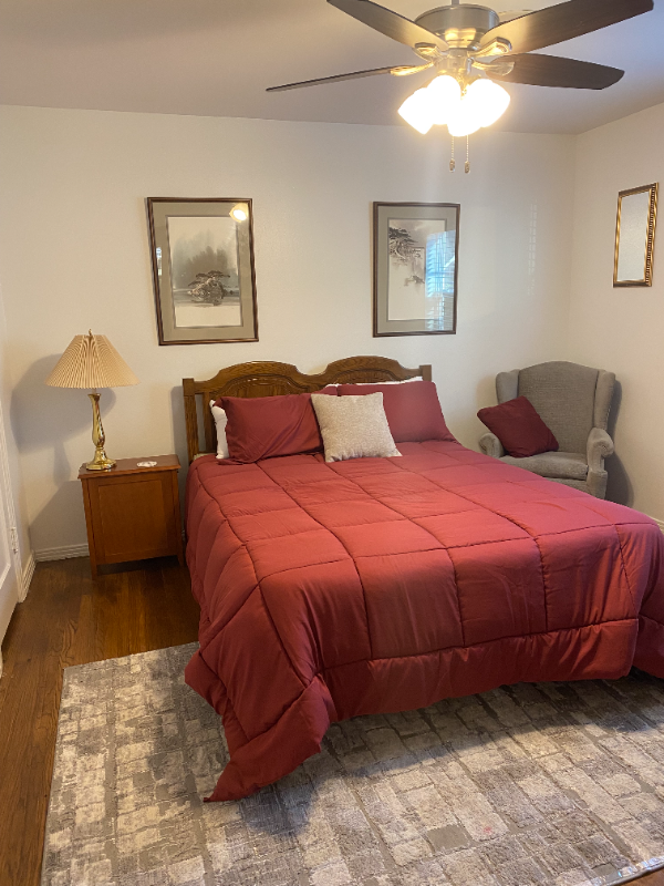 Property Id: 1294627 Private suite, with exterior entrance and alarm system in a quiet older neighborhood. The home has original hardwood floors, suite is one bedroom including queen size bed, recently remodeled bathroom with walk-in shower, and a full kitchen. There's lots of cabinet space in the kitchen, linen closet in hallway, and two closets in bedroom!