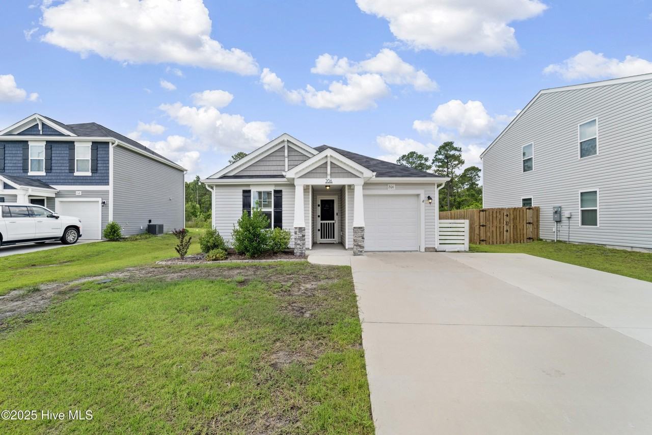 Property Status: Active Welcome to 206 New Home Place in Holly Ridge, NC! This charming 3-bedroom, 2-bath craftsman-style home offers comfort, character, and convenience in one beautiful package. Nestled in a quiet community, the home features an open-concept living space perfect for both relaxing and entertaining. The kitchen is the heart of the home, highlighted by a stunning butcher block island that provides ample prep space and a warm, rustic touch. The spacious primary suite is a peaceful retreat, featuring a custom shiplap accent wall, a generous walk-in closet, and a private en suite bath complete with a double vanity. Two additional bedrooms offer flexibility for guests or a home office. Thoughtfully designed with modern finishes throughout, this home blends style and function effortlessly. Located just a short commute from both Wilmington and nearby military bases, 206 New Home Place offers the ideal balance of coastal living and accessibility. Whether you're enjoying quiet mornings on the porch or hosting gatherings in the open living area, this home has something for everyone. Don't miss your chance to enjoy the charm and comfort of this beautiful Holly Ridge home--schedule your showing today! Office Phone: (910) 333-0055 Copyright © 2026 HIVE MLS. All rights reserved. All information provided by the listing agent/broker is deemed reliable but is not guaranteed and should be independently verified.