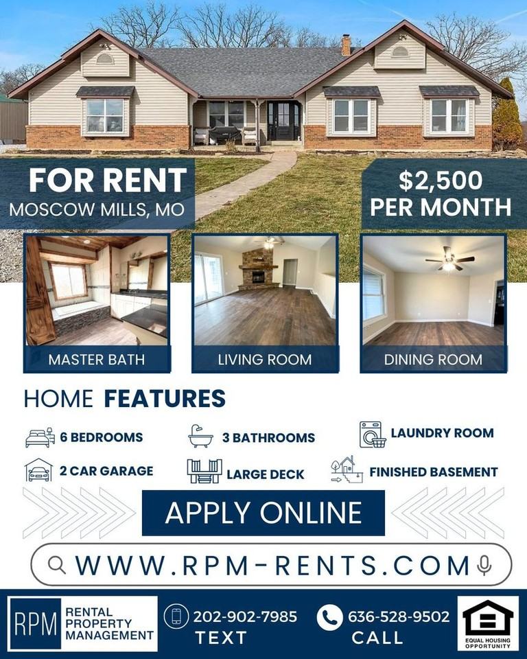 Welcome to this spacious 6 bedroom, 3 bathroom home in Moscow Mills, MO. This home features a large laundry room, 2 car garage, finished basement with a bar, and a large deck perfect for entertaining. The huge master bedroom boasts a luxurious master bath and a large walk-in closet. With an additional dining room, there is plenty of space for hosting gatherings and enjoying meals with loved ones. Don't miss out on the opportunity to make this house your home. Contact us today to schedule a tour!