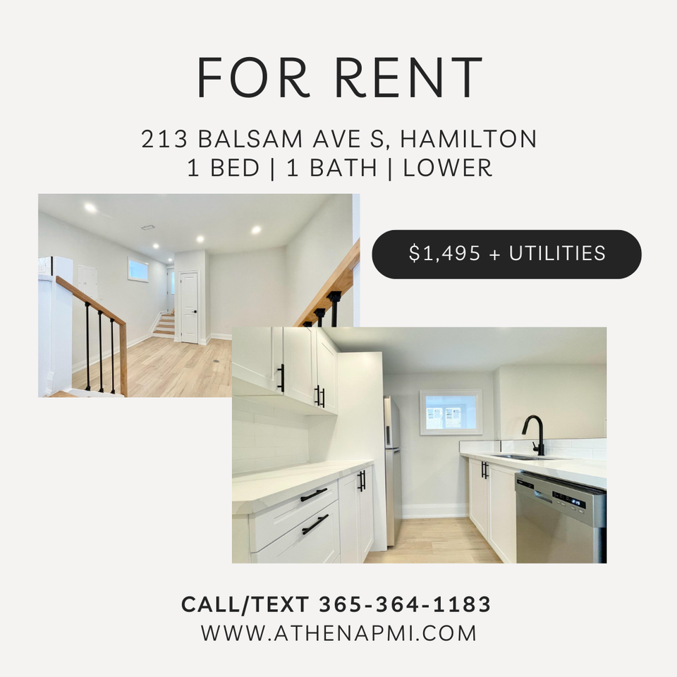 SPECIAL PROMOTION! Currently being offered with 1 month free on a 13 month lease. -- Introducing 213 Balsam Ave S. Hamilton - Basement! This stunning multi-level 1 bed 1 bath lower unit is conveniently located near parks, schools and with easy access to public transit, and all other amenities. Highlights: - Brand new everything - Stainless steel fridge, stove, dishwasher - Washroom w/tub - Central air - Permit parking available Make this your new home for, $1495 + utilities (50% hydro, 25% gas and water) Available for immediate occupancy To book a showing, please call the number or use the link below: 365-364-1183 https app tenantturner com listings athenapmi (Copy and paste to browser if needed) (Note: appliances are on order and will be placed soon)