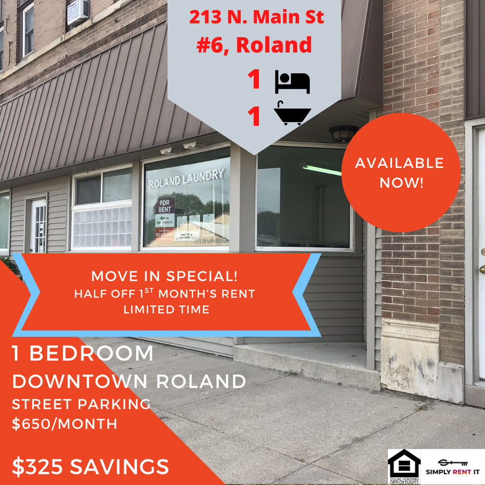 Looking for a clean, affordable, and low maintenance apartment with an easy commute? This updated 1 bedroom in Roland offers quiet living, main-level convenience, and a move-in incentive that makes starting easy. **MOVE-IN SPECIAL – LIMITED TIME. Half off your 1st month's rent when you sign a lease. That is a $325 savings in rent.**Amenities:Updated kitchen area with refrigerator and range with built-in microwave provided. High energy efficient gas furnace. Central air conditioning. Pet Free (no pets)Coin-operated laundry. Street parking is available for use. Utilities IncludeWater/sewerTrashLawn careSnow removalResidents Pay:Gas and Electric through Alliant Energy. Average utilities total $109Cable and Internet if desired. This apartment is perfect for someone who wants simple living, predictable costs, and an affordable alternative to Ames, without sacrificing comfort or convenience. Located in the Roland-Story Community School District. Conveniently located just 10 minutes from Story City and 20–25 minutes from Ames, with quick and easy access to Interstate 35. Message me, call, or text for your personal tour! 515-207-0231