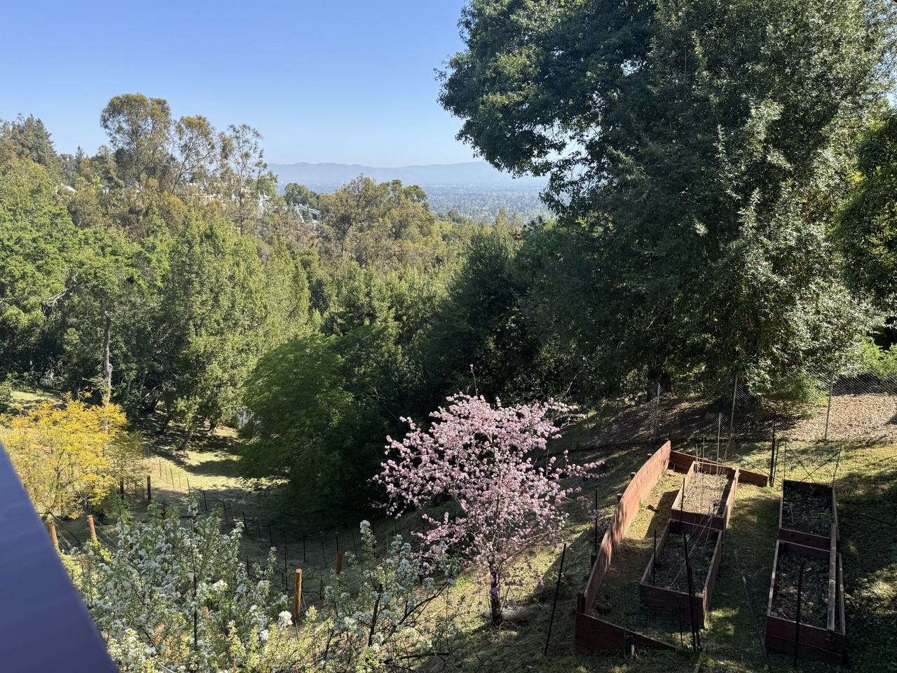 3 min drive to downtown Saratoga and the Wildwood Park! Under 5 min drive to the Saratoga High School, Oak Street Elementary and Foothill Elementary! For those exploring Saratoga, the Saratoga public school district is very small and exclusive with just 3 elementary schools, one middle and one high school, with excellent programs in STEM, music and sports as we personally experienced. The community feeling in Saratoga is very strong with the smaller size allowing for deeper personal lifelong connections to be built. The schools are some of the best in the Bay Area! The house is at the end of Canyon View Drive on what is called the cardio hill by the locals as many people walk the loop on a daily basis so it is never lonely. Fully fenced with automated gates and 3 pedestrian gates! Almost an acre of wooded oasis with an active planted vineyard that makes about 150-200 bottles of the finest California Cabs and Merlot every year. Happy to share the yield and the wine. Being on top of the hill with only one exit road is very secure. It has excellent soothing views of the bay area. The house has a cabin-like feel with high ceilings, big windows, plenty of light and air. It has 6 porches on various levels of the house and a couple meditation benches in the woods overlooking the bay. The entrance is east facing for those who care. Chef's kitchen with the finest and the most beautiful green quartzite slabs that we could buy. Quartzite is a natural stone with the durability of a granite but the beauty of a marble and not to be confused with quartz which is a synthetic product. Two huge Sub-Zero refrigerators and all Wolf appliances with the biggest sink you would find in the market. A gourmet chef's paradise. The kitchen has a custom dining table made of quartzite with an in-built induction stove that has been the highlight of our dinners with friends and family enjoying hot pots, sautees, teas and fondues gathered around the table. The kitchen is also designed to have a working side and a front side so the mess can be hidden in the working side while entertaining. Beautiful all natural bamboo shades around the kitchen and living room. The barbeque porch is right outside the kitchen and has a big granite counter with two sinks and an installed gas line barbecue grill with benches all around so summer entertaining around the grill is easy and fun. Over 50 planted roses that bloom twice a year with plenty of other flowering trees. But roses are our favorites and we have a lot of them. High yield producing fruit trees : Persimmons, Pomegranates, Figs, Apples, Clementines, Lemon, two kinds of Cherries, Blackberry bush, Strawberry planters, Mulberry tree, Peach, Plum and Jujube trees that all fruit annually. Gardening with yard maintenance and water is included in the rent. We have two teams of gardeners, one for the garden and one for the vineyard that come regularly and take care of the yard, garden and vineyard maintenance so the tenants do not have to worry about that. The two car garage has an EV charger. There is plenty of parking outside for guests and friends. Professional installation of the best quality wi-fi infrastructure -Unifi Networks that covers the whole property! We have 4 access points around the house and each access point can support 100+ devices simultaneously if needed. The owners work tech jobs and needed connectivity to be top notch which it is. The tenants are welcome to use the same infrastructure. Our network / electrica..