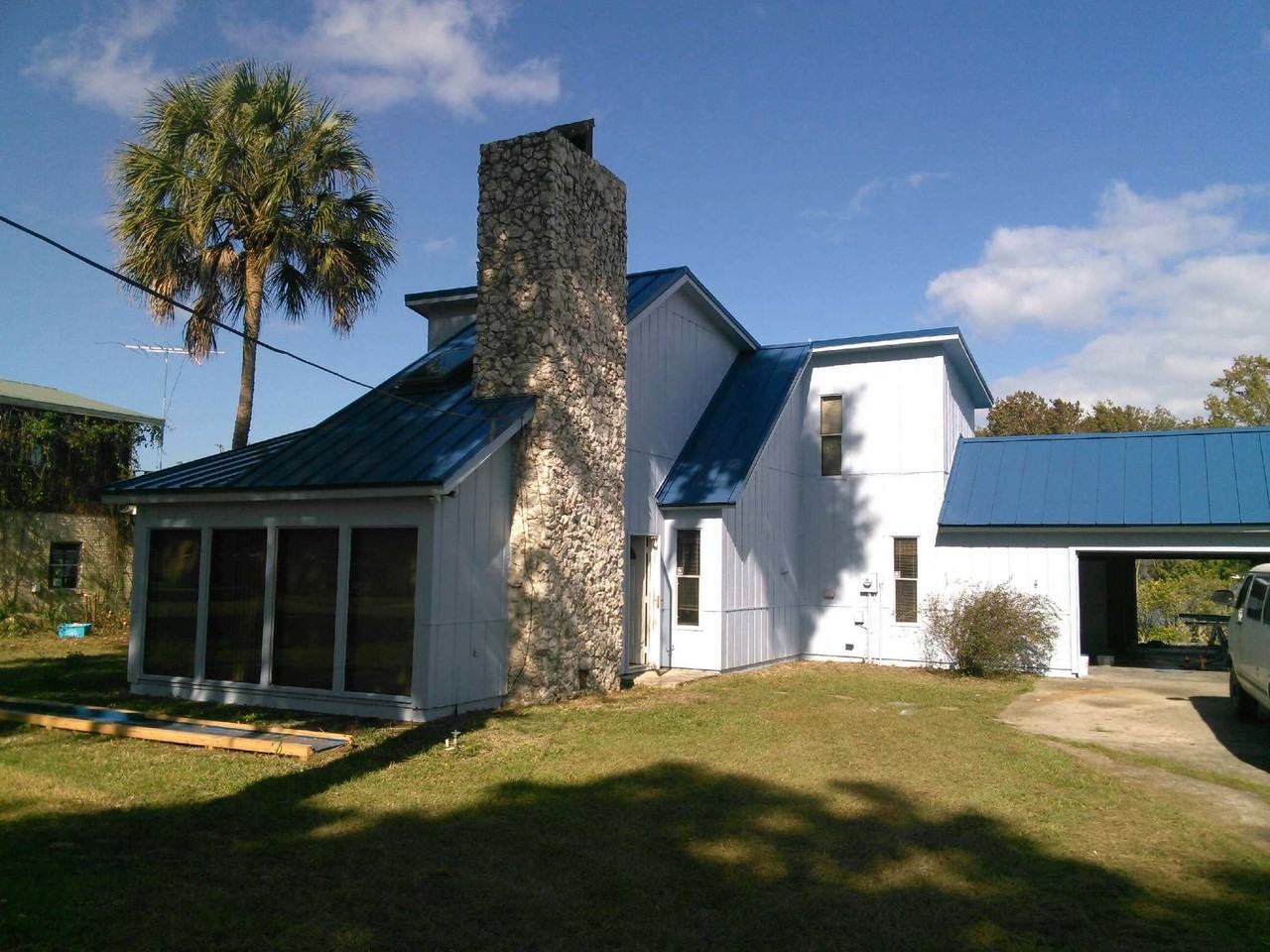 BEAUTIFUL FURNISHED Contemporary home overlooking St Johns River!! ABSOLUTLY NO SMOKING!!! incredible home with 2 master suites the largest of which is downstairs and has vaulted beamed ceiling and door opening onto deck where you can sit and look out over the river while drinking coffee in the morning, or a screened gazebo to enjoy the sunsets at the end of your day. OPEN FLOOR PLAN!! White Kitchen with new refrigerator flows into dining room then step down into newly tiled great room with vaulted wood ceilings and a floor to ceiling stone fireplace, wall of windows on two sides of the room ! lots of natural light !